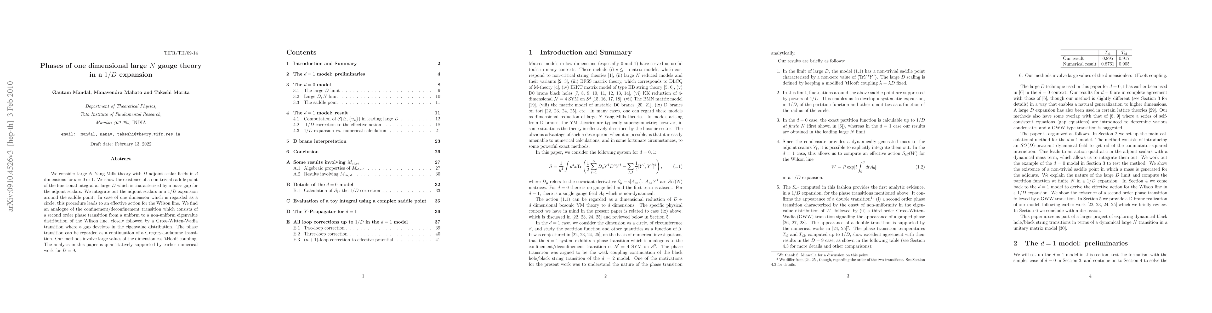 We consider large N Yang Mills theory with D adjoint scalar fields in d dimensions for d=0 or 1. We show the existence of a non-trivial saddle point of the functional integral at large D which is characterized by a mass gap for the adjoint scalars. We integrate out the adjoint scalars in a 1/D expansion around the saddle point. In case of one dimension which is regarded as a circle, this procedure leads to an effective action for the Wilson line. We find an analogue of the confinement/deconfinement transition which consists of a second order phase transition from a uniform to a non-uniform eigenvalue distribution of the Wilson line, closely followed by a Gross-Witten-Wadia transition where a gap develops in the eigenvalue distribution. The phase transition can be regarded as a continuation of a Gregory-Laflamme transition. Our methods involve large values of the dimensionless 'tHooft coupling. The analysis in this paper is quantitatively supported by earlier numerical work for D=9.