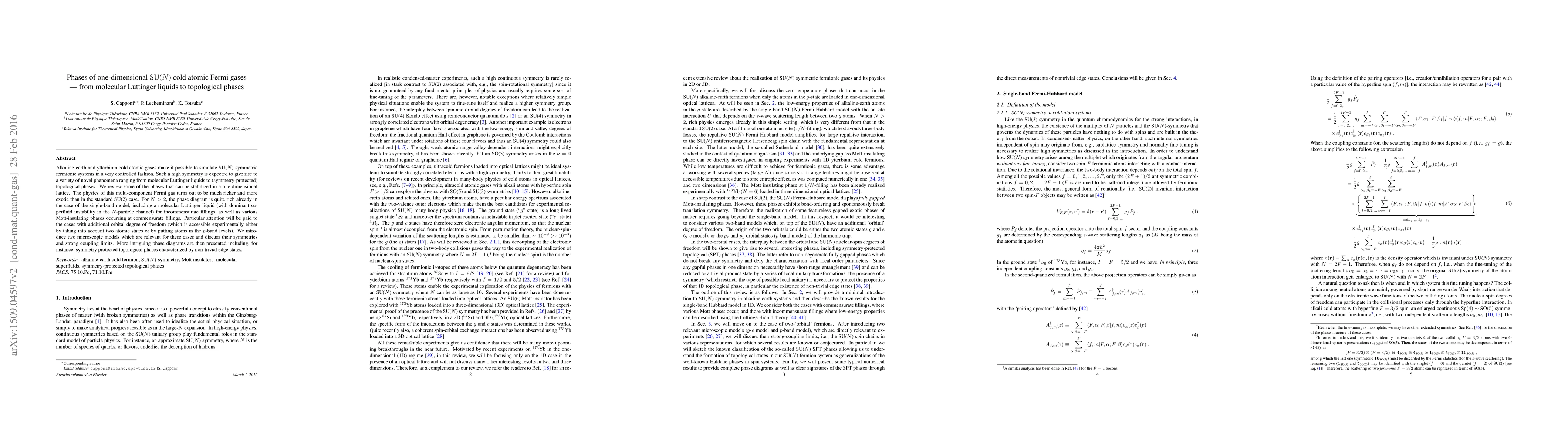 Alkaline-earth and ytterbium cold atomic gases make it possible to simulate SU(N)-symmetric fermionic systems in a very controlled fashion. Such a high symmetry is expected to give rise to a variety of novel phenomena ranging from molecular Luttinger liquids to (symmetry- protected) topological phases. We review some of the phases that can be stabilized in a one dimensional lattice. The physics of this multicomponent Fermi gas turns out to be much richer and more exotic than in the standard SU(2) case. For N > 2, the phase diagram is quite rich already in the case of the single-band model, including a molecular Luttinger liquid (with dominant superfluid instability in the N-particle channel) for incommensurate fillings, as well as various Mott-insulating phases occurring at commensurate fillings. Particular attention will be paid to the cases with additional orbital degree of freedom (which is accessible experimentally either by taking into account two atomic states or by putting atoms in the p-band levels). We introduce two microscopic models which are relevant for these cases and discuss their symmetries and strong coupling limits. More intriguing phase diagrams are then presented including, for instance, symmetry protected topological phases characterized by non-trivial edge states.