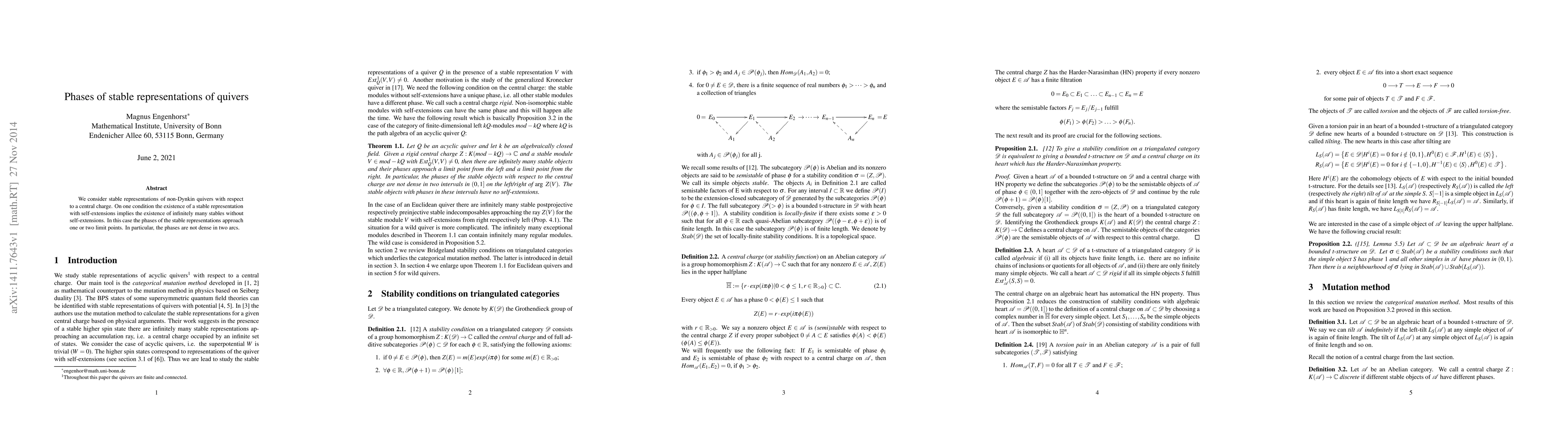 We consider stable representations of non-Dynkin quivers with respect to a central charge. On one condition the existence of a stable representation with self-extensions implies the existence of infinitely many stables without self-extensions. In this case the phases of the stable representations approach one or two limit points. In particular, the phases are not dense in two arcs.
