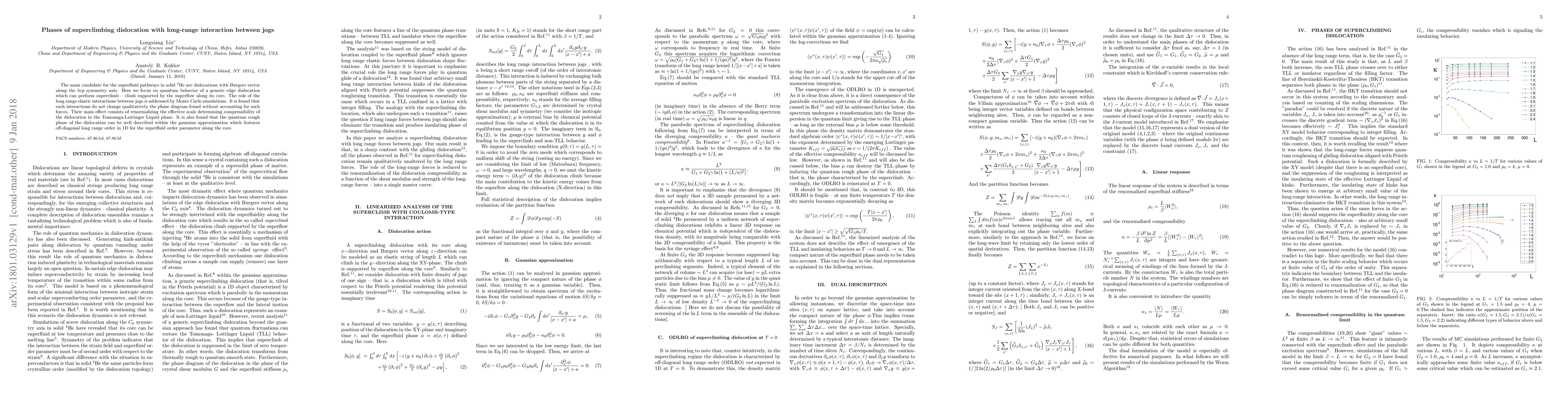 The main candidate for the superfluid pathways in solid Helium-4 are dislocations with Burgers vector along the hcp symmetry axis. Here we focus on quantum behavior of a generic edge dislocation which can perform superclimb -- climb supported by the superflow along its core. The role of the long range elastic interactions between jogs is addressed by Monte Carlo simulations. It is found that such interactions do not change qualitatively the phase diagram found without accounting for such forces. Their main effect consists of renormalizing the effective scale determining compressibility of the dislocation in the Tomonaga-Luttinger Liquid phase. It is also found that the quantum rough phase of the dislocation can be well described within the gaussian approximation which features off-diagonal long range order in 1D for the superfluid order parameter along the core.