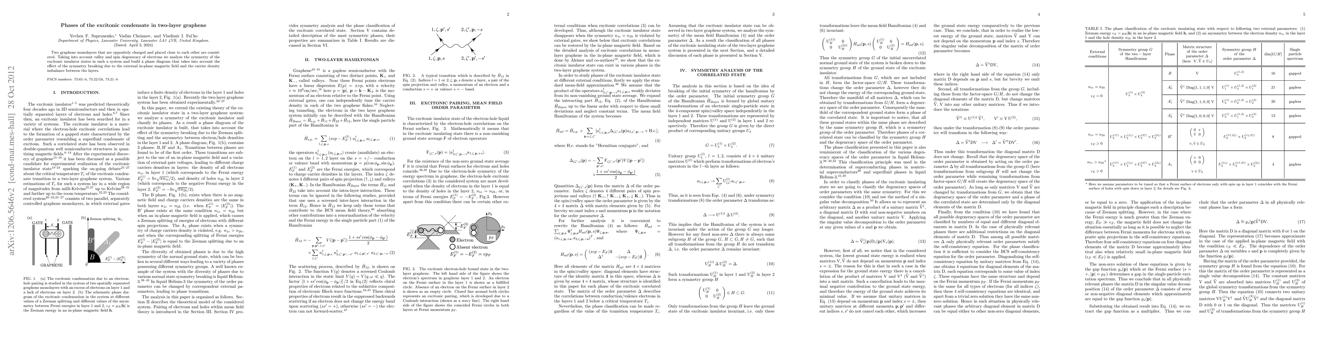 The paper explores the phases of an excitonic condensate in a two-layer graphene system, considering valley and spin degeneracy of electrons. It presents a phase diagram accounting for symmetry-breaking effects from external magnetic fields and carrier density imbalance between layers.