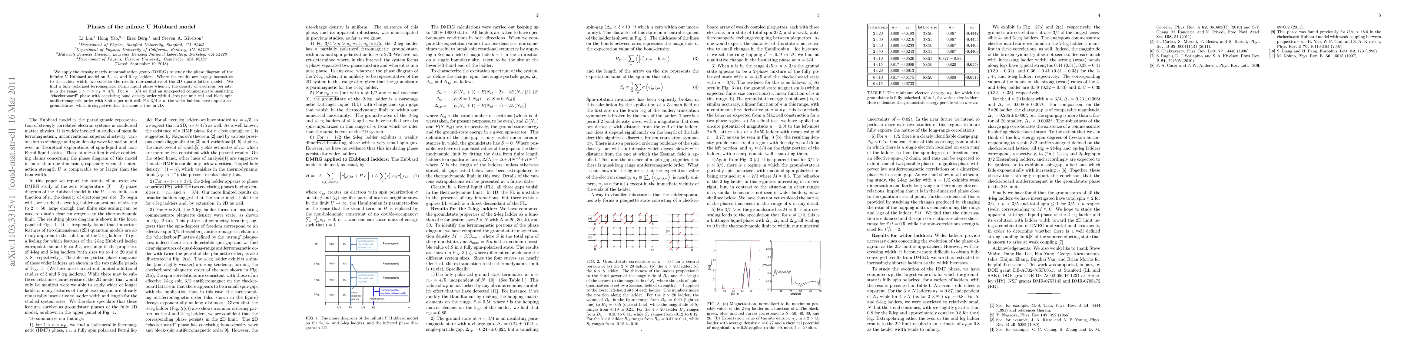 The DMRG study of the infinite U Hubbard model reveals a fully polarized ferromagnetic Fermi liquid phase for electron densities between 1 and n_F ~ 4/5, and an unexpected "checkerboard" insulating phase at n=3/4 with unique bond density order and antiferromagnetic spin structure. The results suggest broader ladders and likely 2D lattices exhibit unpolarized groundstates for higher densities.