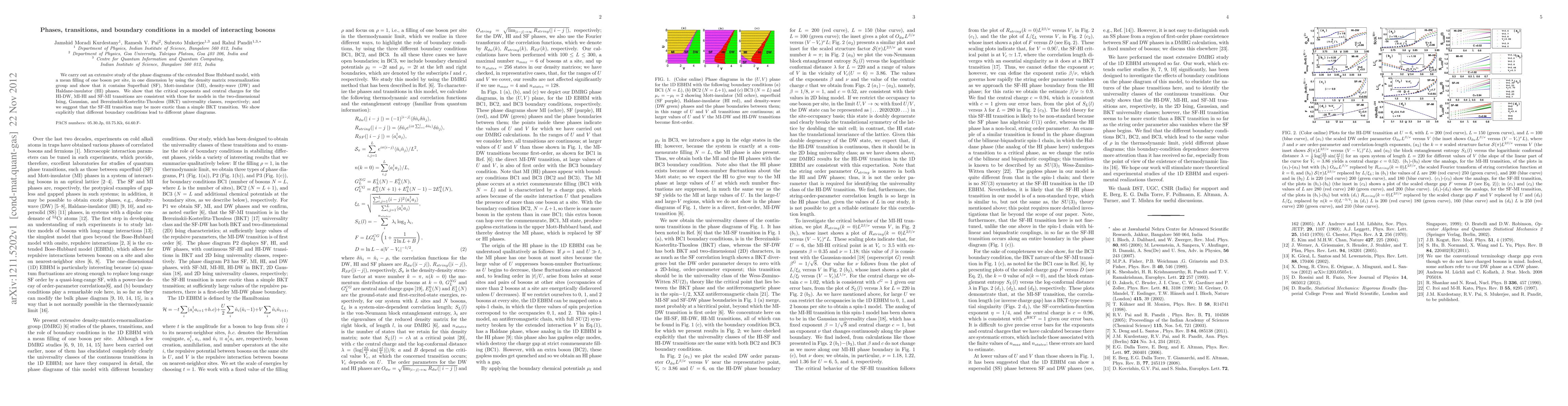We carry out an extensive study of the phase diagrams of the extended Bose Hubbard model, with a mean filling of one boson per site, in one dimension by using the density matrix renormalization group and show that it contains Superfluid (SF), Mott-insulator (MI), density-wave (DW) and Haldane-insulator (HI) phases. We show that the critical exponents and central charges for the HI-DW, MI-HI and SF-MI transitions are consistent with those for models in the two-dimensional Ising, Gaussian, and Berezinskii-Kosterlitz-Thouless (BKT) universality classes, respectively; and we suggest that the SF-HI transition may be more exotic than a simple BKT transition. We show explicitly that different boundary conditions lead to different phase diagrams.