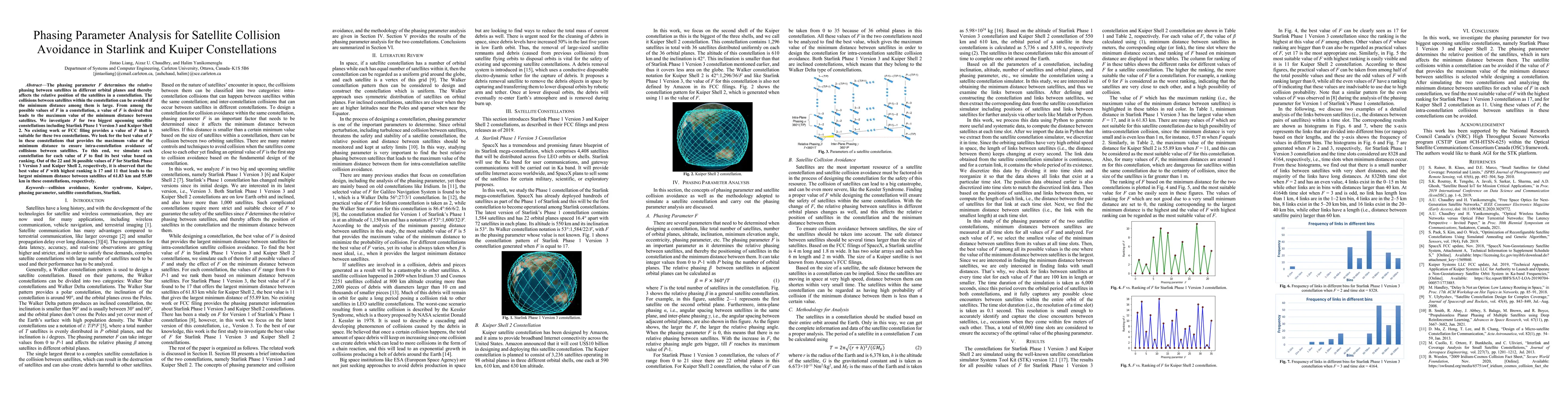 The phasing parameter F determines the relative phasing between satellites in different orbital planes and thereby affects the relative position of the satellites in a constellation. The collisions between satellites within the constellation can be avoided if the minimum distance among them is large. From among the possible values of F in a constellation, a value of F is desired that leads to the maximum value of the minimum distance between satellites. We investigate F for two biggest upcoming satellite constellations including Starlink Phase 1 Version 3 and Kuiper Shell 2. No existing work or FCC filing provides a value of F that is suitable for these two constellations. We look for the best value of F in these constellations that provides the maximum value of the minimum distance to ensure intra-constellation avoidance of collisions between satellites. To this end, we simulate each constellation for each value of F to find its best value based on ranking. Out of the 22 and 36 possible values of F for Starlink Phase 1 Version 3 and Kuiper Shell 2, respectively, it is observed that the best value of F with highest ranking is 17 and 11 that leads to the largest minimum distance between satellites of 61.83 km and 55.89 km in these constellations, respectively.