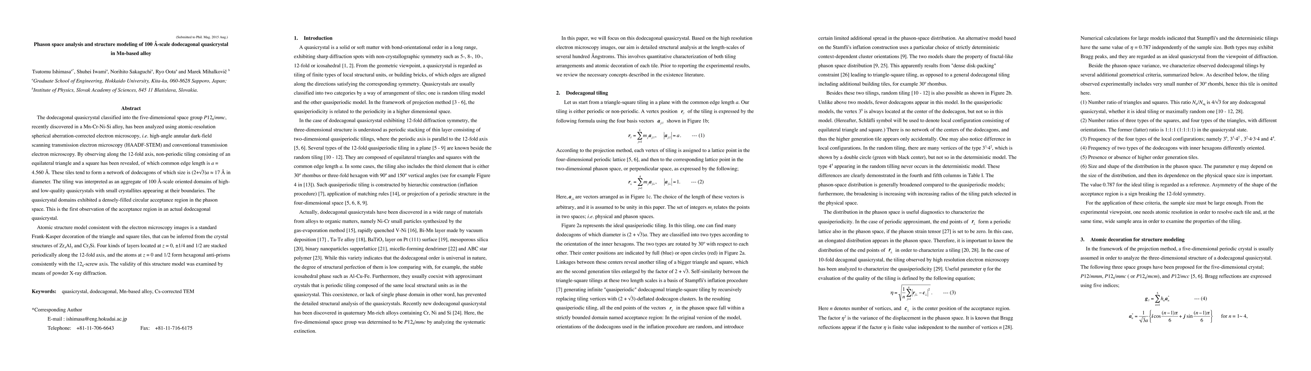 This paper analyzes the atomic structure of a 100 A-scale dodecagonal quasicrystal in a Mn-based alloy using high-resolution electron microscopy, revealing a tiling network of equilateral triangles and squares. The proposed atomic structure model, based on Frank-Kasper decoration, is validated by powder X-ray diffraction.