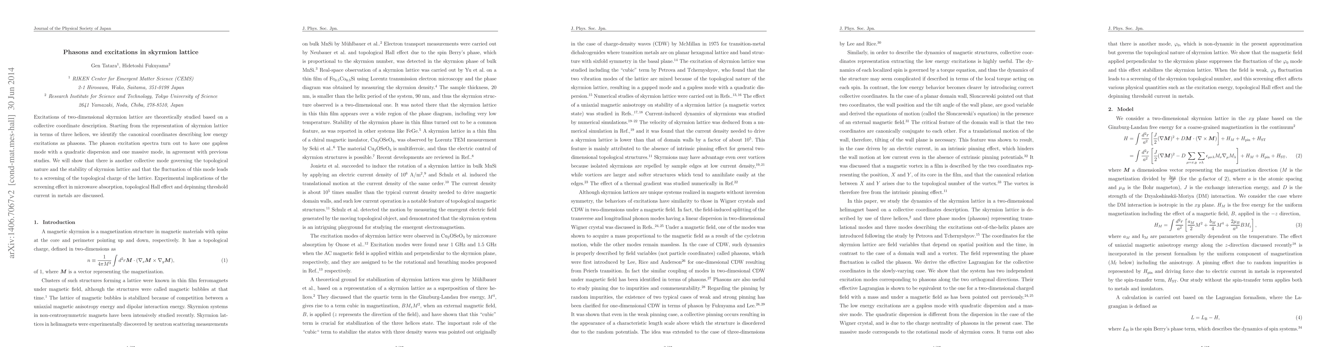 Excitations of two-dimensional skyrmion lattice are theoretically studied based on a collective coordinate description. Starting from the representation of skyrmion lattice in terms of three helices, we identify the canonical coordinates describing low energy excitations as phasons. The phason excitation spectra turn out to have one gapless mode with a quadratic dispersion and one massive mode, in agreement with previous studies. We will show that there is another collective mode governing the topological nature and the stability of skyrmion lattice and that the fluctuation of this mode leads to a screening of the topological charge of the lattice. Experimental implications of the screening effect in microwave absorption, topological Hall effect and depinning threshold current in metals are discussed.