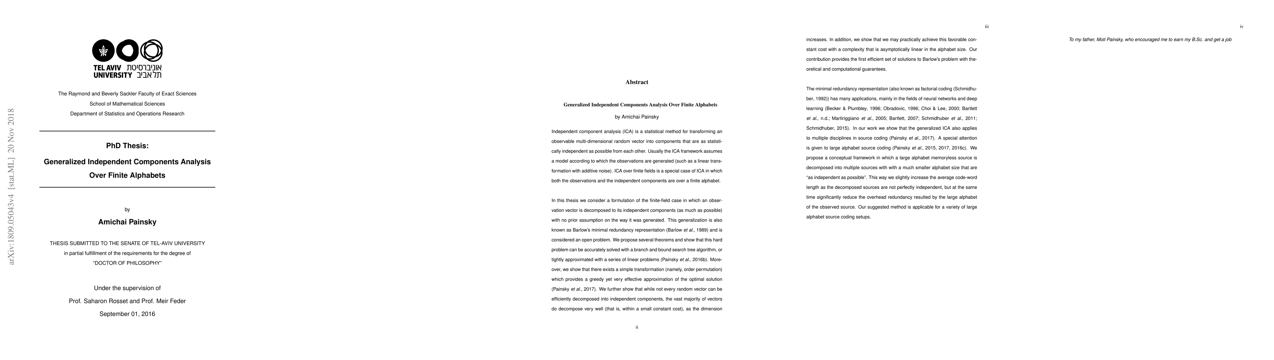 This dissertation generalizes independent component analysis (ICA) over finite alphabets, proposing algorithms to decompose observation vectors into independent components without prior assumptions. It introduces a branch and bound algorithm and a simple order permutation method for effective approximation, demonstrating practical efficiency and applicability in source coding applications.