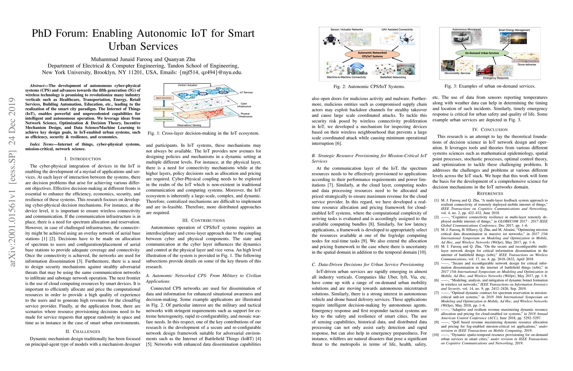 The development of autonomous cyber-physical systems (CPS) and advances towards the fifth generation (5G) of wireless technology is promising to revolutionize many industry verticals such as Healthcare, Transportation, Energy, Retail Services, Building Automation, Education, etc., leading to the realization of the smart city paradigm. The Internet of Things (IoT), enables powerful and unprecedented capabilities for intelligent and autonomous operation. We leverage ideas from Network Science, Optimization & Decision Theory, Incentive Mechanism Design, and Data Science/Machine Learning to achieve key design goals, in IoT-enabled urban systems, such as efficiency, security & resilience, and economics.