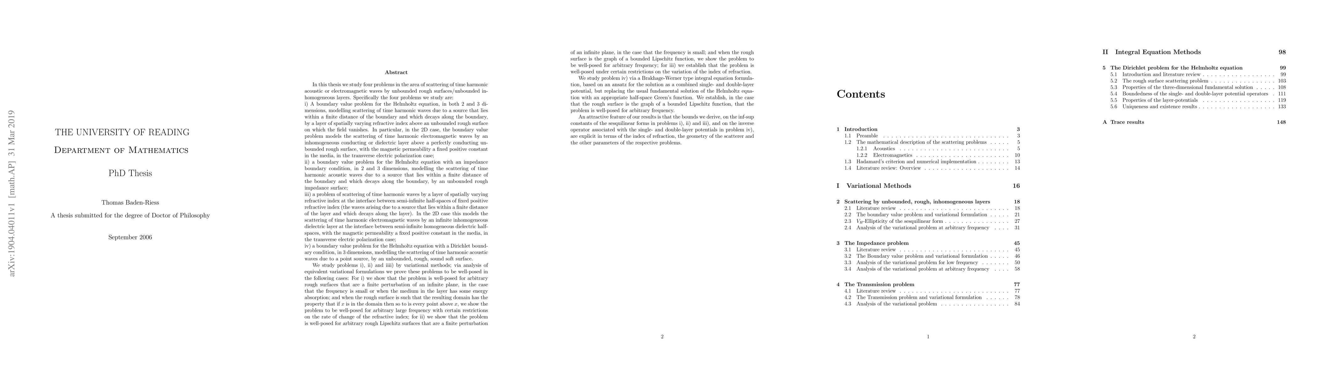 We study 4 problems in the area of scattering of time harmonic acoustic or electromagnetic waves by unbounded rough surfaces/inhomogeneous layers. Specifically we study: i) a boundary value problem (BVP) for the Helmholtz equation, in both 2 and 3 dimensions, modelling scattering of time harmonic waves due to a source that lies within a finite distance of the boundary and which decays along the boundary, by a layer of spatially varying refractive index above an unbounded rough surface on which the field vanishes; ii) a BVP for the Helmholtz equation with an impedance boundary condition, in 2 and 3 dimensions, modelling the scattering of time harmonic acoustic waves due to a source that lies within a finite distance of the boundary and which decays along the boundary, by an unbounded rough impedance surface; iii) a problem of scattering of time harmonic waves by a layer of spatially varying refractive index at the interface between semi-infinite half-spaces of fixed positive refractive index (the waves arising due to a source that lies within a finite distance of the layer and which decays along the layer); iv) a BVP for the Helmholtz equation with a Dirichlet boundary condition, in 3 dimensions, modelling the scattering of time harmonic acoustic waves due to a point source, by an unbounded, rough, sound soft surface. We study i), ii) and iii) by variational methods; via analysis of equivalent variational formulations we prove these problems to be well-posed under various restrictions on the surface (must be Lipschitz), the frequency, the rate of change of the refractive index etc. We study iv) via a Brakhage-Werner type integral equation formulation, based on an ansatz for the solution as a combined single- and double-layer potential. We establish that when the rough surface is the graph of a Lipschitz function, the problem is well-posed for arbitrary frequency.