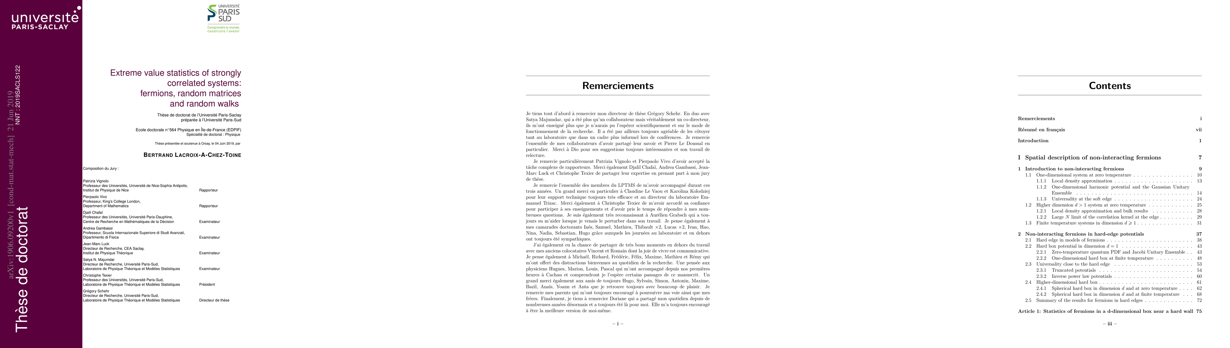 This thesis investigates extreme value statistics in strongly correlated systems through three models: trapped fermions, random matrices, and random walks. It develops novel mappings between trapped Fermi gas and random matrix theory, providing exact descriptions of spatial statistics near the edge. It also addresses extreme value questions in random walks, obtaining analytical results for gap statistics in discrete processes.
