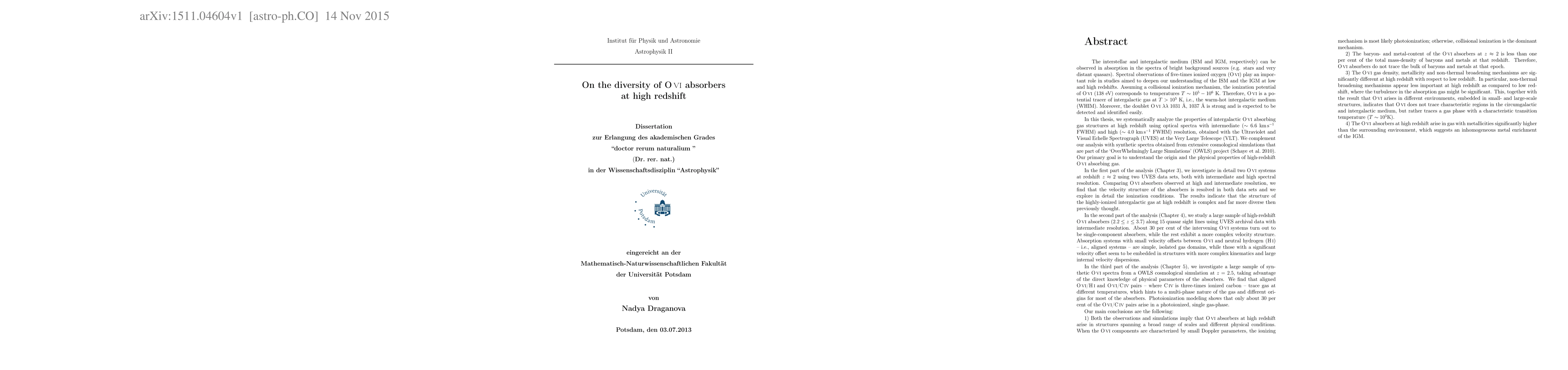 This thesis investigates the properties of high-redshift O vi absorbers using optical spectra and cosmological simulations, revealing that O vi arises in diverse structures and conditions, with photoionization and collisional ionization as primary mechanisms. It concludes that O vi does not trace the bulk of baryons and metals at high redshift, and its properties differ significantly from those at low redshift.