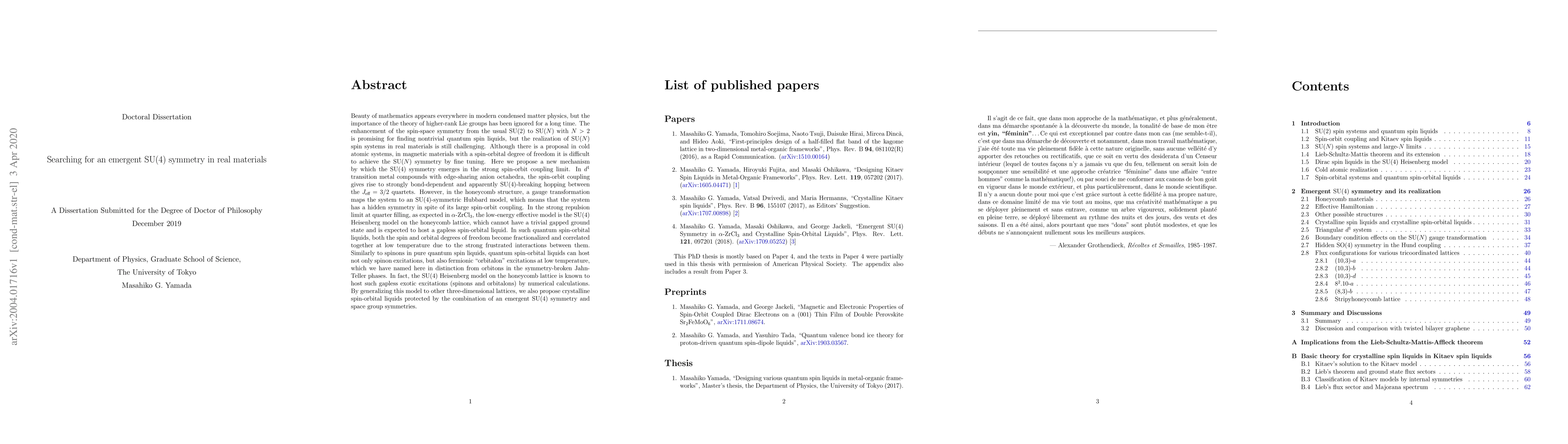 This PhD thesis proposes a new mechanism for emergent SU(4) symmetry in real materials, specifically in $d^1$ transition metal compounds with strong spin-orbit coupling. It suggests that despite apparent SU(4)-breaking interactions, a gauge transformation reveals a hidden SU(4) symmetry in honeycomb structures, leading to a SU(4) Heisenberg model that predicts a gapless spin-orbital liquid state.