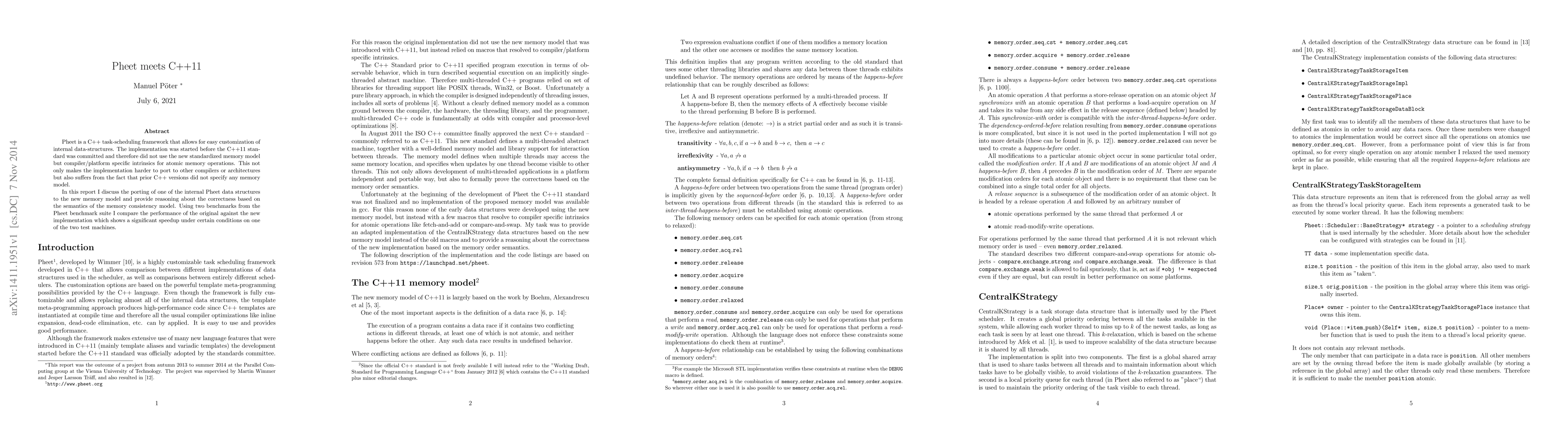 Pheet is a C++ task-scheduling framework that allows for easy customization of internal data-structures. The implementation was started before the C++11 standard was committed and therefore did not use the new standardized memory model but compiler/platform specific intrinsics for atomic memory operations. This not only makes the implementation harder to port to other compilers or architectures but also suffers from the fact that prior C++ versions did not specify any memory model. In this report I discuss the porting of one of the internal Pheet data structures to the new memory model and provide reasoning about the correctness based on the semantics of the memory consistency model. Using two benchmarks from the Pheet benchmark suite I compare the performance of the original against the new implementation which shows a significant speedup under certain conditions on one of the two test machines.