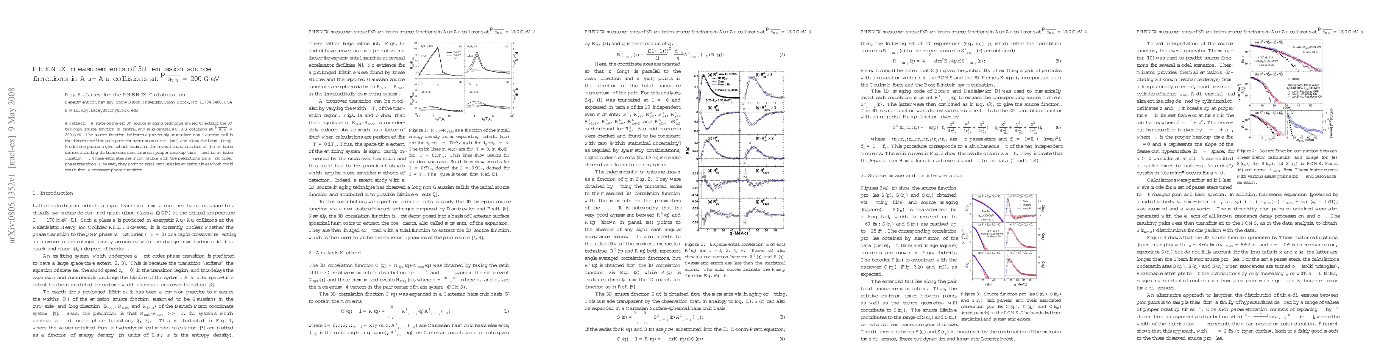 The PHENIX experiment employs advanced 3D source imaging to analyze the two-pion source function in Au+Au collisions at 200 GeV, revealing a non-Gaussian tail and suggesting significant relative emission times, which indicate a possible crossover phase transition rather than a first-order phase transition.