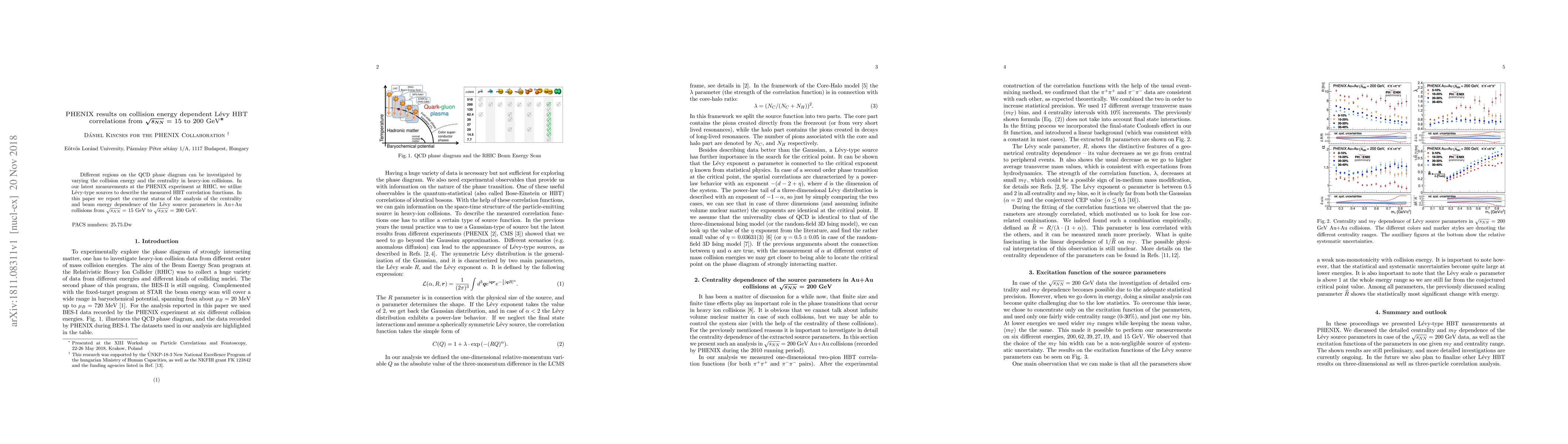 Different regions on the QCD phase diagram can be investigated by varying the collision energy and the centrality in heavy-ion collisions. In our latest measurements at the PHENIX experiment at RHIC, we utilize L\'evy-type sources to describe the measured HBT correlation functions. In this paper we report the current status of the analysis of the centrality and beam energy dependence of the L\'evy source parameters in Au+Au collisions from $\sqrt{s_{NN}}$ = 15 GeV to $\sqrt{s_{NN}}$ = 200 GeV.