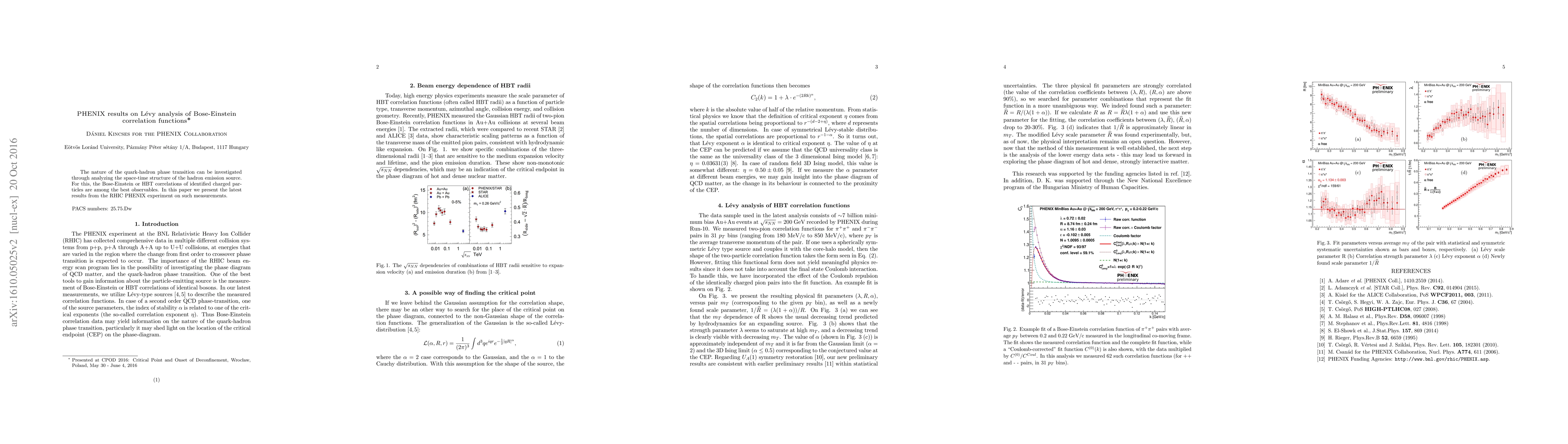 This paper reports findings from the PHENIX experiment at RHIC on the analysis of Bose-Einstein correlation functions to investigate the space-time structure of the quark-hadron phase transition, utilizing L\'evy analysis for deeper insights.