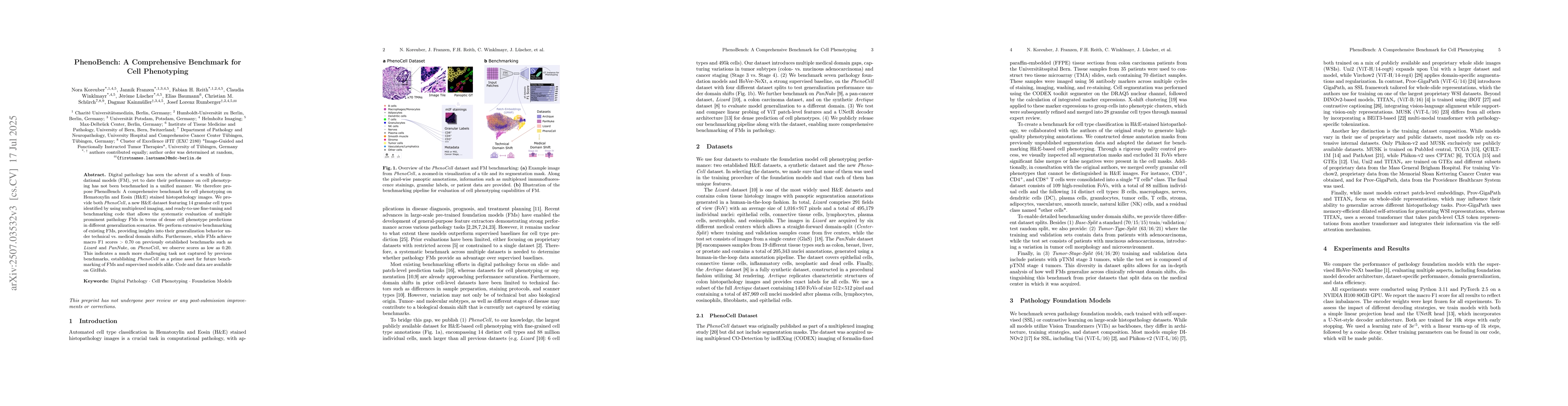 Digital pathology has seen the advent of a wealth of foundational models (FM), yet to date their performance on cell phenotyping has not been benchmarked in a unified manner. We therefore propose PhenoBench: A comprehensive benchmark for cell phenotyping on Hematoxylin and Eosin (H&E) stained histopathology images. We provide both PhenoCell, a new H&E dataset featuring 14 granular cell types identified by using multiplexed imaging, and ready-to-use fine-tuning and benchmarking code that allows the systematic evaluation of multiple prominent pathology FMs in terms of dense cell phenotype predictions in different generalization scenarios. We perform extensive benchmarking of existing FMs, providing insights into their generalization behavior under technical vs. medical domain shifts. Furthermore, while FMs achieve macro F1 scores > 0.70 on previously established benchmarks such as Lizard and PanNuke, on PhenoCell, we observe scores as low as 0.20. This indicates a much more challenging task not captured by previous benchmarks, establishing PhenoCell as a prime asset for future benchmarking of FMs and supervised models alike. Code and data are available on GitHub.