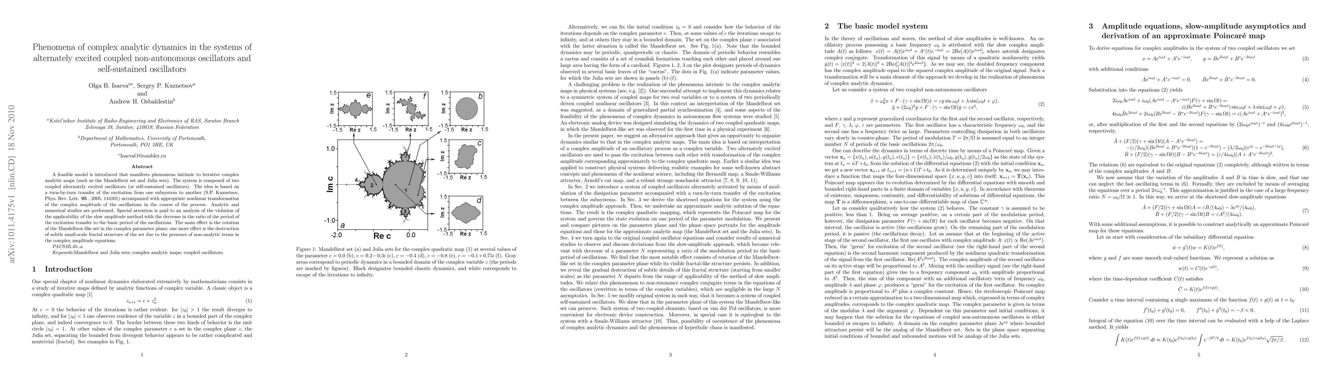 A feasible model is introduced that manifests phenomena intrinsic to iterative complex analytic maps (such as the Mandelbrot set and Julia sets). The system is composed of two coupled alternately excited oscillators (or self-sustained oscillators). The idea is based on a turn-by-turn transfer of the excitation from one subsystem to another (S.P.~Kuznetsov, Phys.~Rev.~Lett. \bf 95 \rm, 2005, 144101) accompanied with appropriate nonlinear transformation of the complex amplitude of the oscillations in the course of the process. Analytic and numerical studies are performed. Special attention is paid to an analysis of the violation of the applicability of the slow amplitude method with the decrease in the ratio of the period of the excitation transfer to the basic period of the oscillations. The main effect is the rotation of the Mandelbrot-like set in the complex parameter plane; one more effect is the destruction of subtle small-scale fractal structure of the set due to the presence of non-analytic terms in the complex amplitude equations.