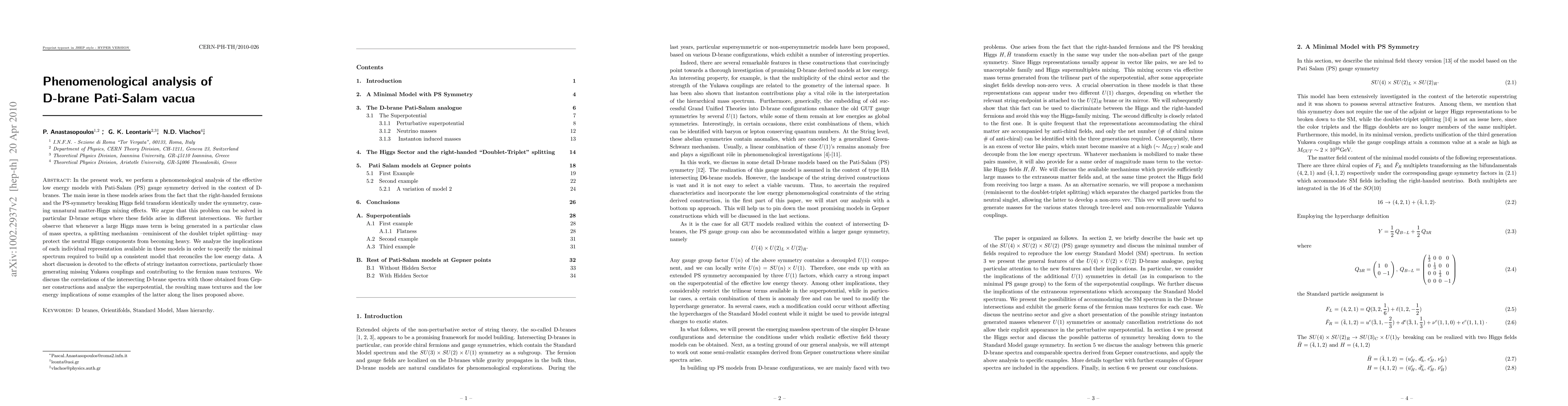 In the present work we perform a phenomenological analysis of the effective low energy models with Pati-Salam (PS) gauge symmetry derived in the context of D-branes. A main issue in these models arises from the fact that the right-handed fermions and the PS-symmetry breaking Higgs field transform identically under the PS symmetry, causing unnatural matter-Higgs mixing effects. We argue that this problem could be solved in particular D-brane setups where these fields arise in different intersections. We further observe that whenever a large Higgs mass term is generated in a particular class of mass spectra, a splitting mechanism -reminiscent of the doublet triplet splitting- may protect the neutral Higgs components from a heavy mass term. We analyze the implications of each individual representation which in principle is available in these models in order to specify the minimal spectrum required to build up a consistent PS model which reconciles the low energy data. A short discussion is devoted on the effects of stringy instanton corrections, particularly those generating missing Yukawa couplings and contributing to the fermion mass textures. We discuss the correlations of the intersecting D-brane spectra with those obtained from Gepner constructions and analyze the superpotential, the resulting mass textures and the low energy implications of some examples of the latter along the lines proposed above.