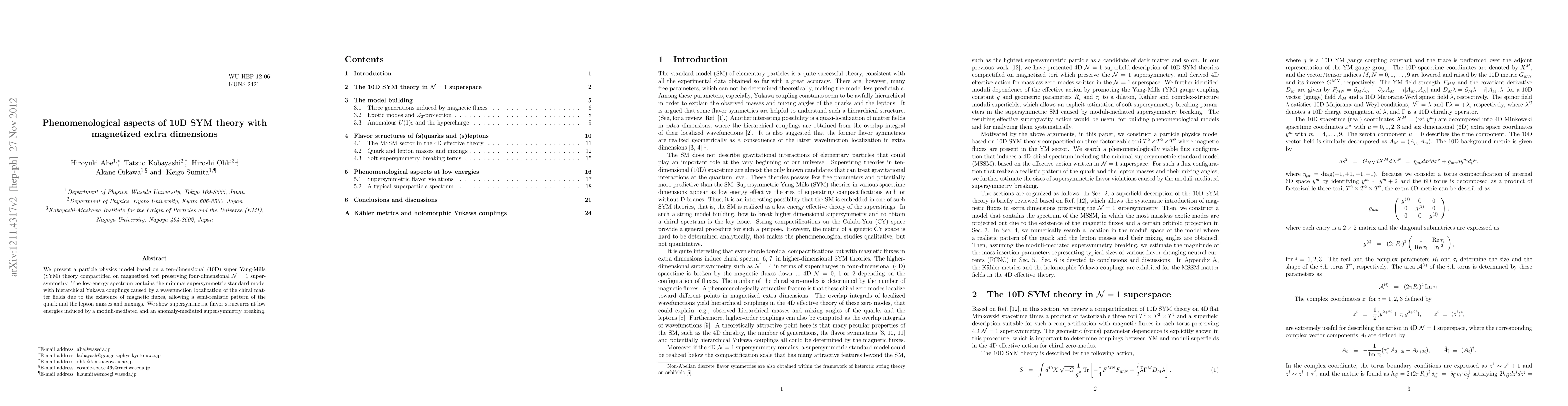 This paper explores a 10D super Yang-Mills theory compactified on magnetized tori, resulting in a four-dimensional $\mathcal{N}=1$ supersymmetric model. It proposes a mechanism for hierarchical Yukawa couplings and realistic quark and lepton masses through wavefunction localization of chiral fields influenced by magnetic fluxes, alongside a supersymmetric flavor structure from moduli-mediated and anomaly-mediated supersymmetry breaking.