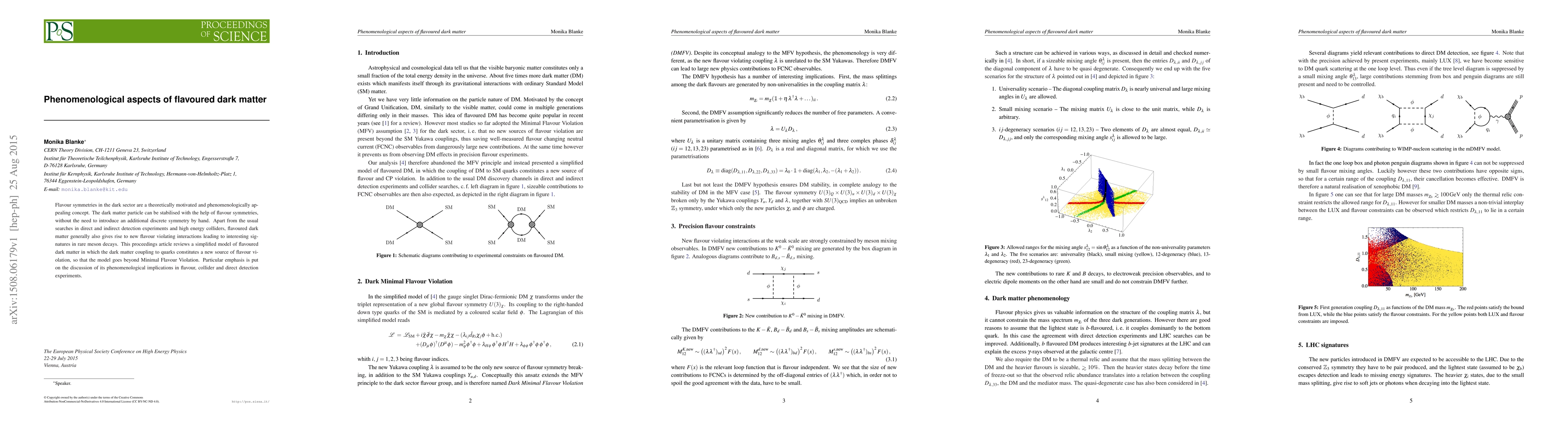 This paper explores a simplified model of flavoured dark matter, where dark matter particles are stabilized using flavour symmetries, leading to new flavour-violating interactions. It highlights the phenomenological implications for rare meson decays, collider experiments, and direct detection methods.
