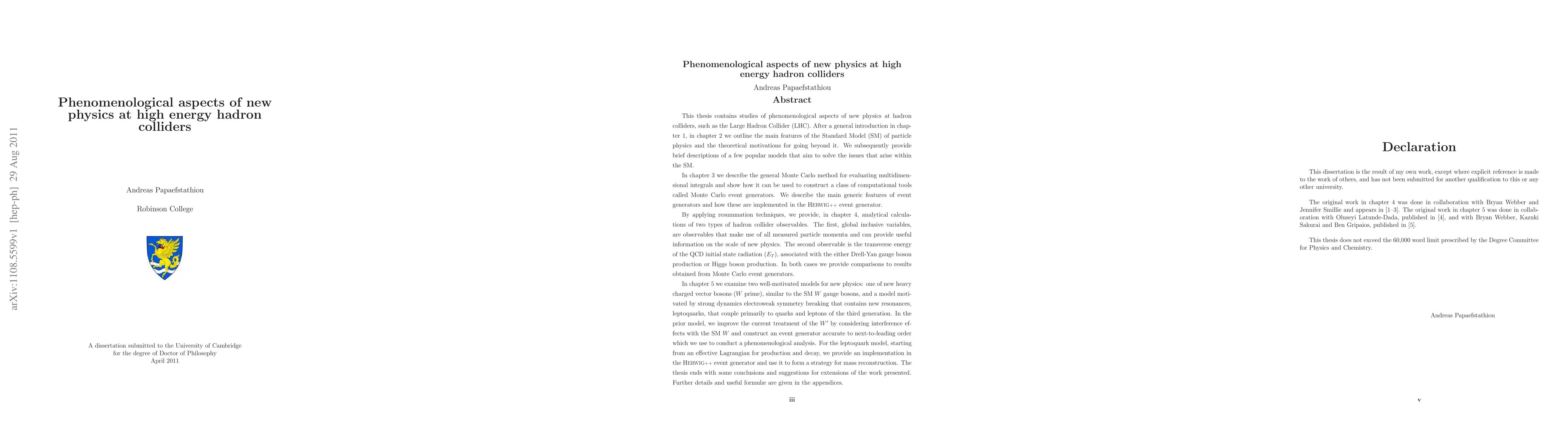 A general introduction is given in chapter 1. Chapter 2 outlines the main features of the Standard Model (SM) of particle physics and the theoretical motivations for going beyond it. We subsequently provide brief descriptions of a few popular models that aim to solve the issues that arise within the SM. In chapter 3 we describe the general Monte Carlo method and show how it can be used to construct a class of computational tools called Monte Carlo event generators. We describe the main generic features of event generators and how these are implemented in the HERWIG++ event generator. By applying resummation techniques, we provide, in chapter 4, analytical calculations of two types of hadron collider observables: global inclusive variables and the transverse energy of the QCD initial state radiation (ET), associated with the either Drell-Yan gauge boson production or Higgs boson production. In both cases we provide comparisons to results obtained from Monte Carlo event generators. In chapter 5 we examine two well-motivated models for new physics: one of new heavy charged vector bosons (W prime) and a model motivated by strong dynamics electroweak symmetry breaking that contains new resonances, leptoquarks, that couple primarily to quarks and leptons of the third generation. In the prior model, we improve the current treatment of the W' by considering interference effects with the SM W and construct an event generator accurate to next-to-leading order which we use to conduct a phenomenological analysis. For the leptoquark model, we provide an implementation in the HERWIG++ event generator and use it to form a strategy for mass reconstruction.