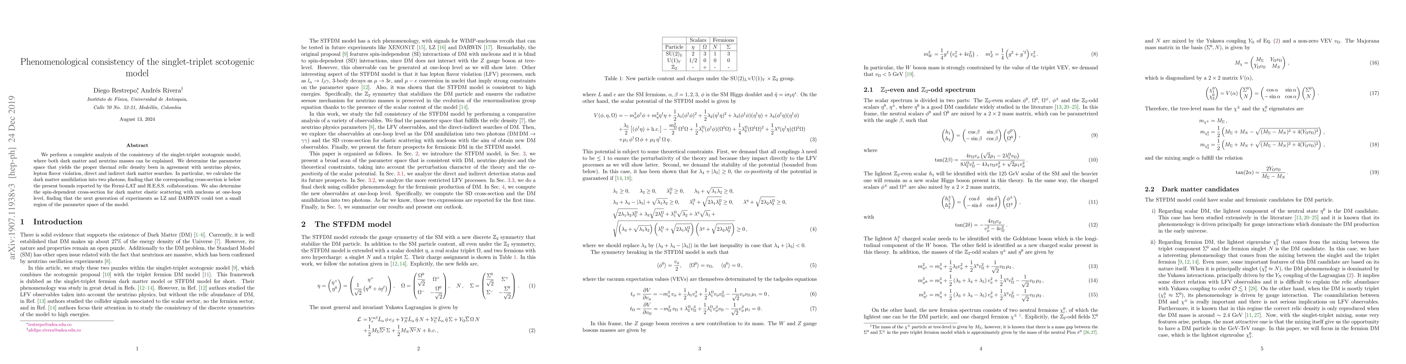 We perform a complete analysis of the consistency of the singlet-triplet scotogenic model, where both dark matter and neutrino masses can be explained. We determine the parameter space that yields the proper thermal relic density been in agreement with neutrino physics, lepton flavor violation, direct and indirect dark matter searches. In particular, we calculate the dark matter annihilation into two photons, finding that the corresponding cross-section is below the present bounds reported by the Fermi-LAT and H.E.S.S. collaborations. We also determine the spin-dependent cross-section for dark matter elastic scattering with nucleons at one-loop level, finding that the next generation of experiments as LZ and DARWIN could test a small region of the parameter space of the model.