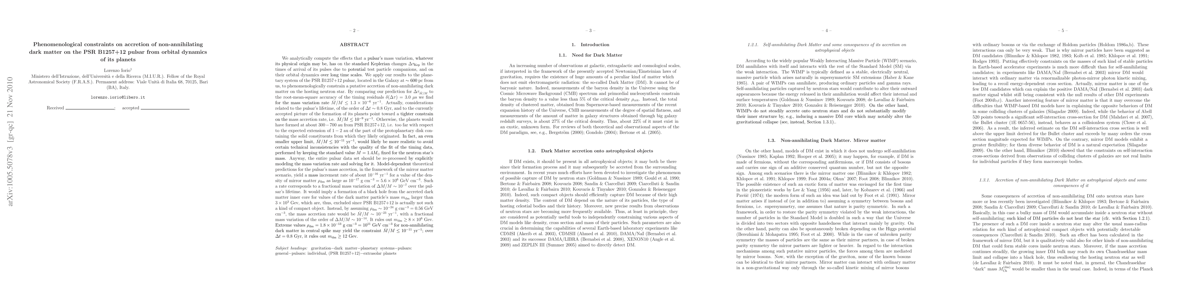 We analytically compute the effects that a mass variation rate \dot M/M of a pulsar may have on the changes \Delta\tau in the times of arrival of its pulses due to test particle companions, and on their orbital dynamics. We apply our results to the planetary system of the PSR B1257+12 pulsar, located in the Galaxy at 600 pc from us, to phenomenologically constrain a putative accretion of non-annihilating dark matter on the hosting neutron star. (Abridged)