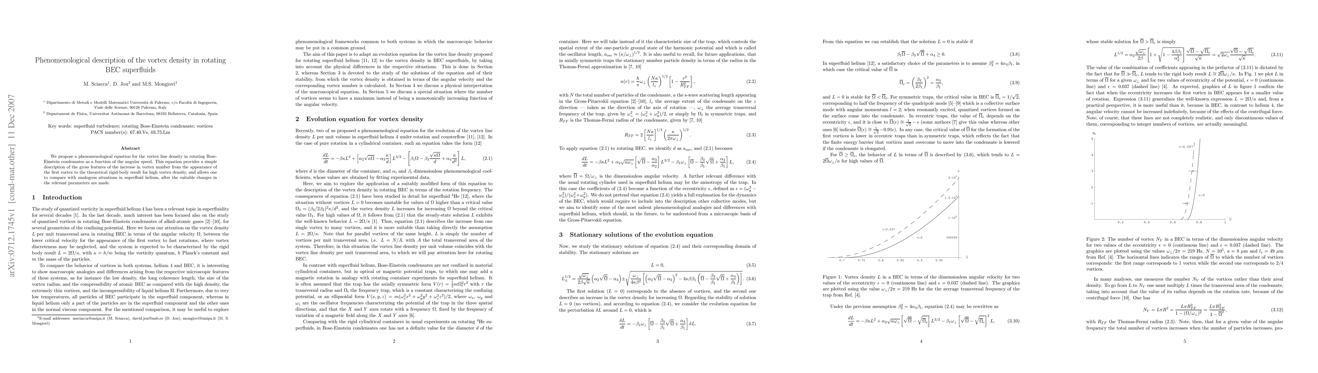 We propose a phenomenological equation for the vortex line density in rotating Bose-Einstein condensates as a function of the angular speed. This equation provides a simple description of the gross features of the increase in vortex number from the appearance of the first vortex to the theoretical rigid-body result for high vortex density, and allows one to compare with analogous situations in superfluid helium, after the suitable changes in the relevant parameters are made.