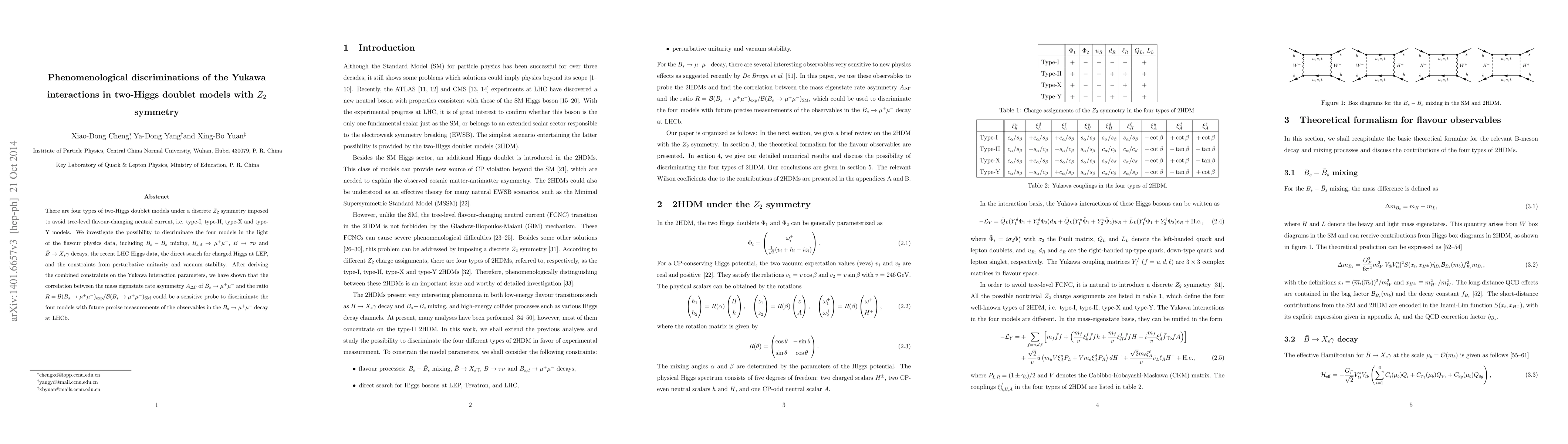 There are four types of two-Higgs doublet models under a discrete $Z_2$ symmetry imposed to avoid tree-level flavour-changing neutral current, i.e. type-I, type-II, type-X and type-Y models. We investigate the possibility to discriminate the four models in the light of the flavour physics data, including $B_s-\bar B_s$ mixing, $B_{s,d} \to \mu^+ \mu^-$, $B\to \tau\nu$ and $\bar B \to X_s \gamma$ decays, the recent LHC Higgs data, the direct search for charged Higgs at LEP, and the constraints from perturbative unitarity and vacuum stability. After deriving the combined constraints on the Yukawa interaction parameters, we have shown that the correlation between the mass eigenstate rate asymmetry $A_{\Delta\Gamma}$ of $B_{s} \to \mu^+ \mu^-$ and the ratio $R={\cal B}(B_{s} \to \mu^+ \mu^-)_{exp}/ {\cal B}(B_{s} \to \mu^+ \mu^-)_{SM}$ could be sensitive probe to discriminate the four models with future precise measurements of the observables in the $B_{s} \to \mu^+ \mu^-$ decay at LHCb.