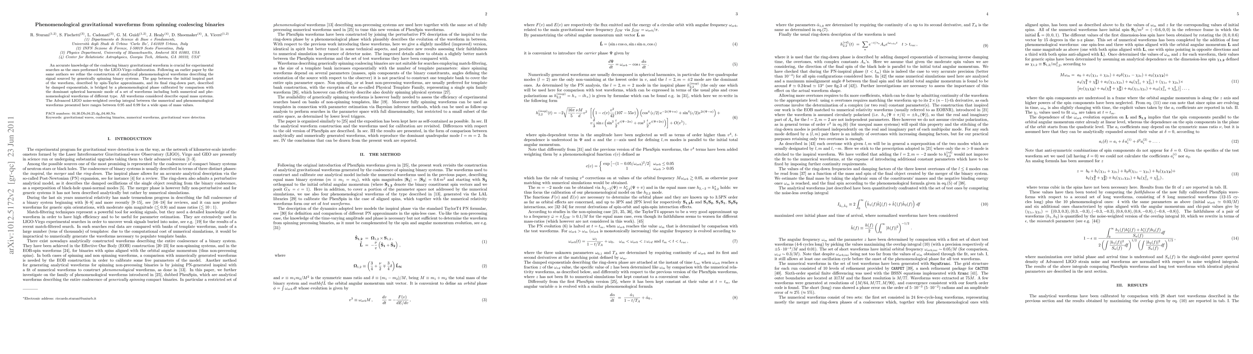 An accurate knowledge of the coalescing binary gravitational waveform is crucial for experimental searches as the ones performed by the LIGO-Virgo collaboration. Following an earlier paper by the same authors we refine the construction of analytical phenomenological waveforms describing the signal sourced by generically spinning binary systems. The gap between the initial inspiral part of the waveform, described by spin-Taylor approximants, and its final ring-down part, described by damped exponentials, is bridged by a phenomenological phase calibrated by comparison with the dominant spherical harmonic mode of a set of waveforms including both numerical and phenomenological waveforms of different type. All waveforms considered describe equal mass systems. The Advanced LIGO noise-weighted overlap integral between the numerical and phenomenological waveforms presented here ranges between 0.95 and 0.99 for a wide span of mass values.