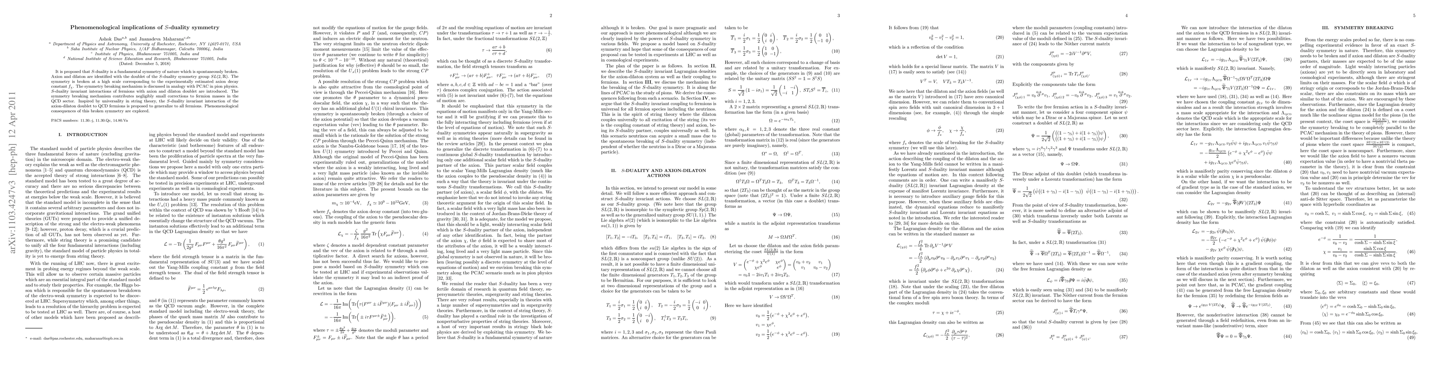 It is proposed that $S$-duality is a fundamental symmetry of nature which is spontaneously broken. Axion and dilaton are identified with the doublet of the $S$-duality symmetry group $SL(2,\mathbbm{R})$. The symmetry is broken at a high scale corresponding to the experimentally estimated axion decay constant $f_{\chi}$. The symmetry breaking mechanism is discussed in analogy with PCAC in pion physics. $S$-duality invariant interactions of fermions with axion and dilaton doublet are introduced. The symmetry breaking mechanism contributes negligibly small corrections to fermion masses in the QCD sector. Inspired by universality in string theory, the $S$-duality invariant interaction of the axion-dilaton doublet to QCD fermions is proposed to generalize to all fermions. Phenomenological consequences of this broken symmetry are explored.