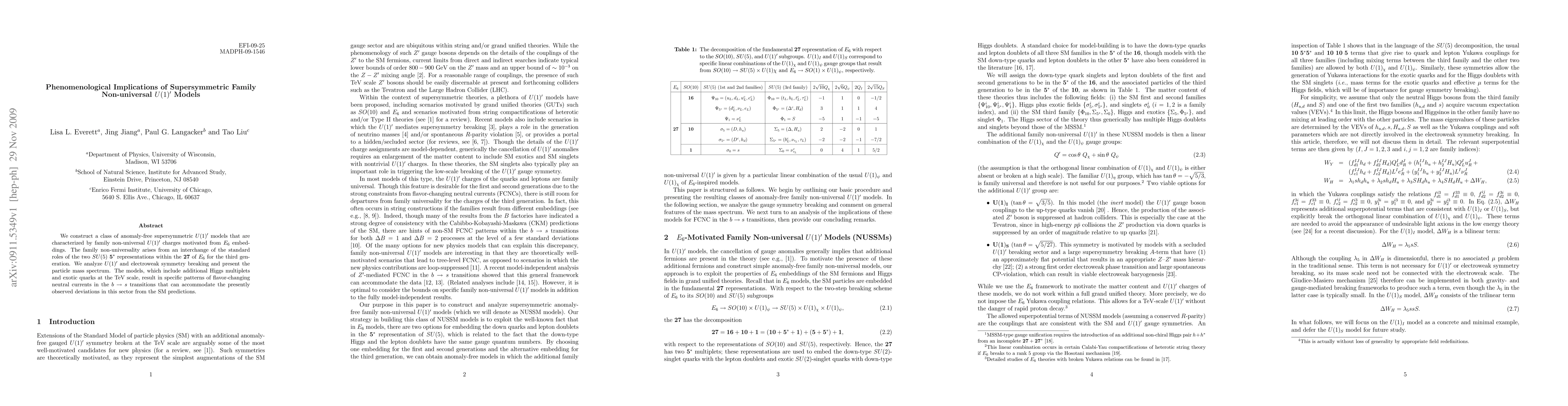 We construct a class of anomaly-free supersymmetric U(1)' models that are characterized by family non-universal U(1)' charges motivated from E_6 embeddings. The family non-universality arises from an interchange of the standard roles of the two SU(5) 5* representations within the 27 of E_6 for the third generation. We analyze U(1)' and electroweak symmetry breaking and present the particle mass spectrum. The models, which include additional Higgs multiplets and exotic quarks at the TeV scale, result in specific patterns of flavor-changing neutral currents in the b to s transitions that can accommodate the presently observed deviations inthis sector from the SM predictions.