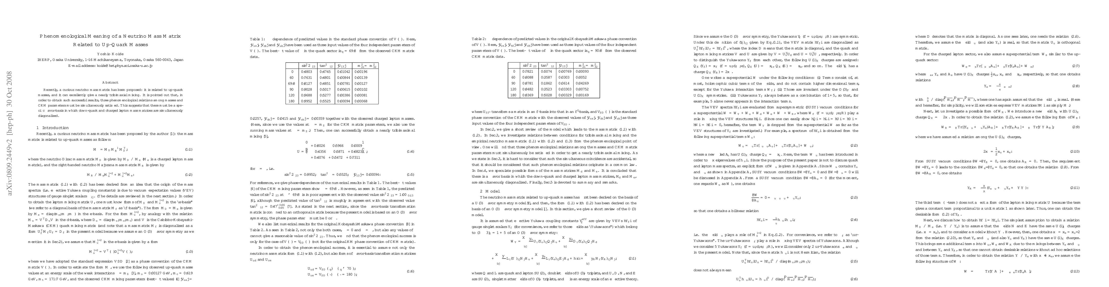 Recently, a curious neutrino mass matrix has been proposed: it is related to up-quark masses, and it can excellently give a nearly tribimaxial mixing. It is pointed out that, in order to obtain such successful results, three phenomenological relations among masses and CKM parameters must be simultaneously satisfied. This suggests that there must be a specific flavor-basis in which down-quark and charged lepton mass matrices are simultaneously diagonalized.