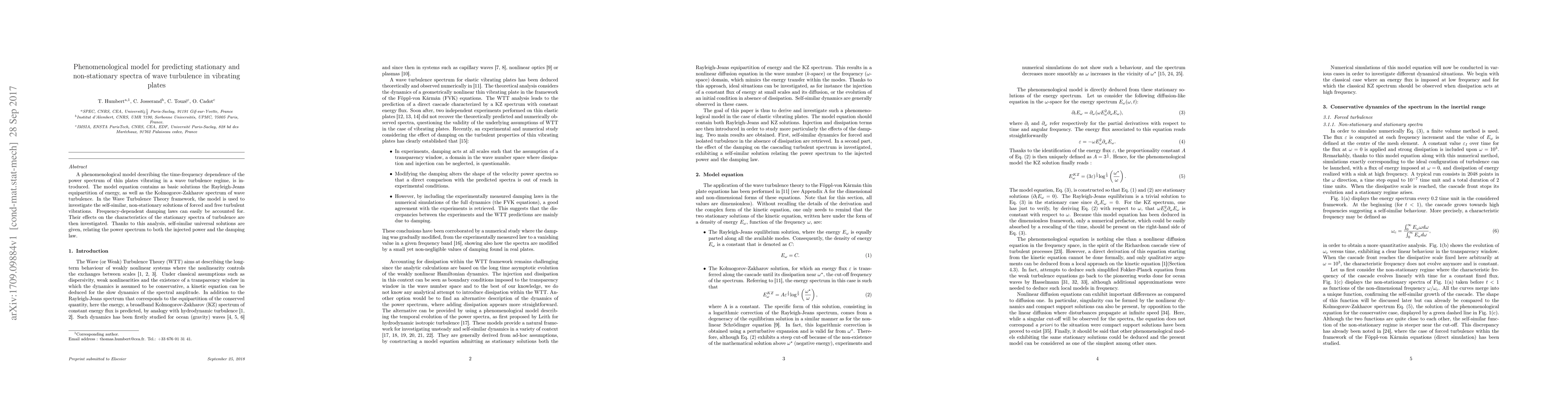 This paper introduces a phenomenological model to predict stationary and non-stationary spectra of wave turbulence in vibrating thin plates, incorporating the Rayleigh-Jeans equipartition and the Kolmogorov-Zakharov spectrum. The model analyzes self-similar, non-stationary solutions and investigates the effects of frequency-dependent damping on the turbulence power spectrum.