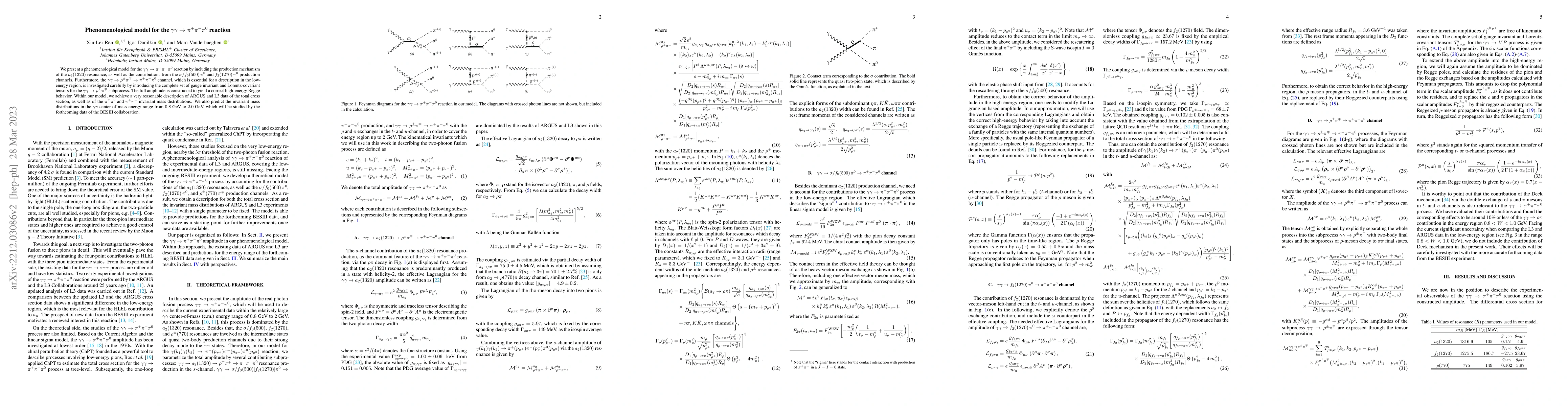 This paper introduces a phenomenological model for the $\gamma\gamma \to \pi^+\pi^-\pi^0$ reaction, incorporating the $a_2(1320)$ resonance and contributions from $\sigma/f_0(500)\, \pi^0$ and $f_2(1270)\, \pi^0$ channels. The model also carefully investigates the $\gamma\gamma\to\rho^{\pm} \pi^{\mp}\to\pi^{+}\pi^-\pi^0$ channel, achieving a good fit to existing data and predicting future results for the BESIII collaboration.