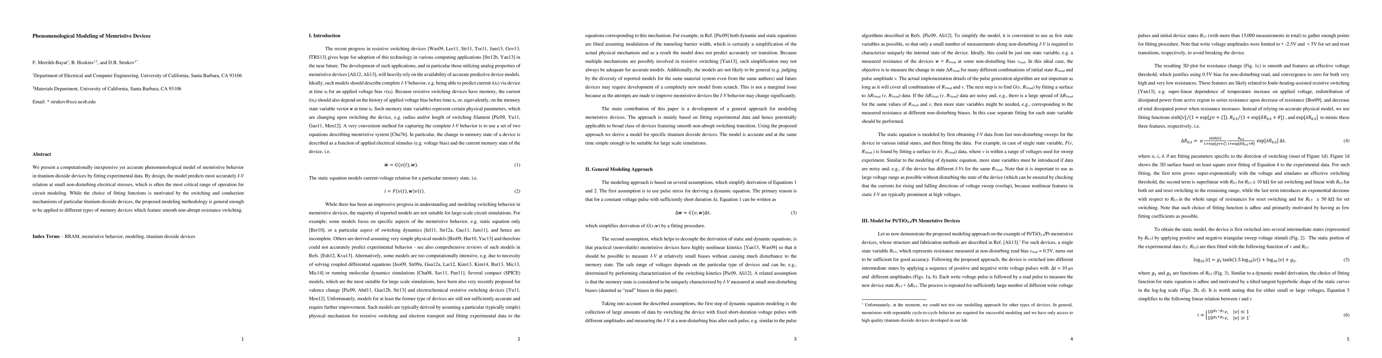 This paper introduces a phenomenological model for memristive behavior in titanium dioxide devices, accurately predicting I-V relations under small electrical stresses. The model is computationally efficient and general enough to apply to various memory devices with smooth resistance switching.