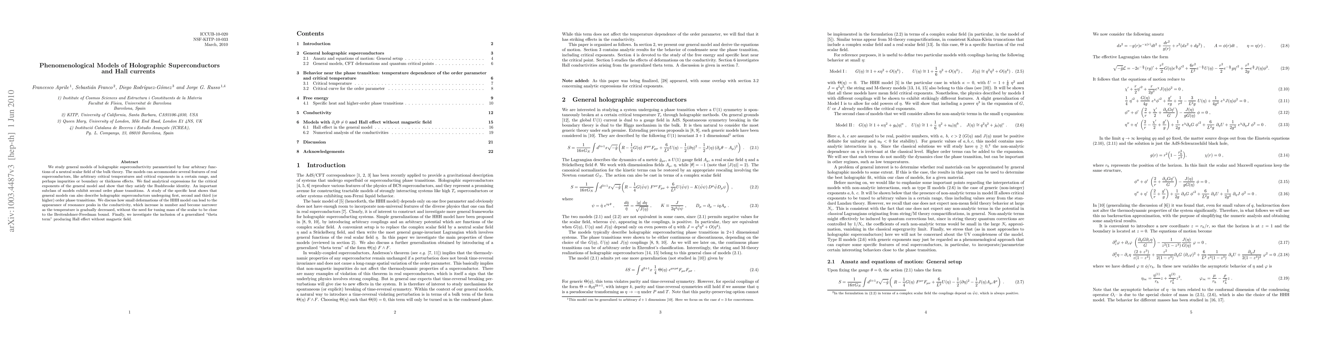 We study general models of holographic superconductivity parametrized by four arbitrary functions of a neutral scalar field of the bulk theory. The models can accommodate several features of real superconductors, like arbitrary critical temperatures and critical exponents in a certain range, and perhaps impurities, boundary or thickness effects. We find analytical expressions for the critical exponents of the general model and show that they satisfy the Rushbrooke identity. An important subclass of models exhibits second order phase transitions. A study of the specific heat shows that general models can also describe holographic superconductors undergoing first, second and third (or higher) order phase transitions. We discuss how small deformations of the HHH model lead to the appearance of resonance peaks in the conductivity, which become narrower as the temperature is gradually decreased, without the need for tuning mass of the scalar to be close to the Breitenlohner-Freedman bound. Finally, we investigate the inclusion of a generalized "theta term" producing Hall effect without magnetic field.