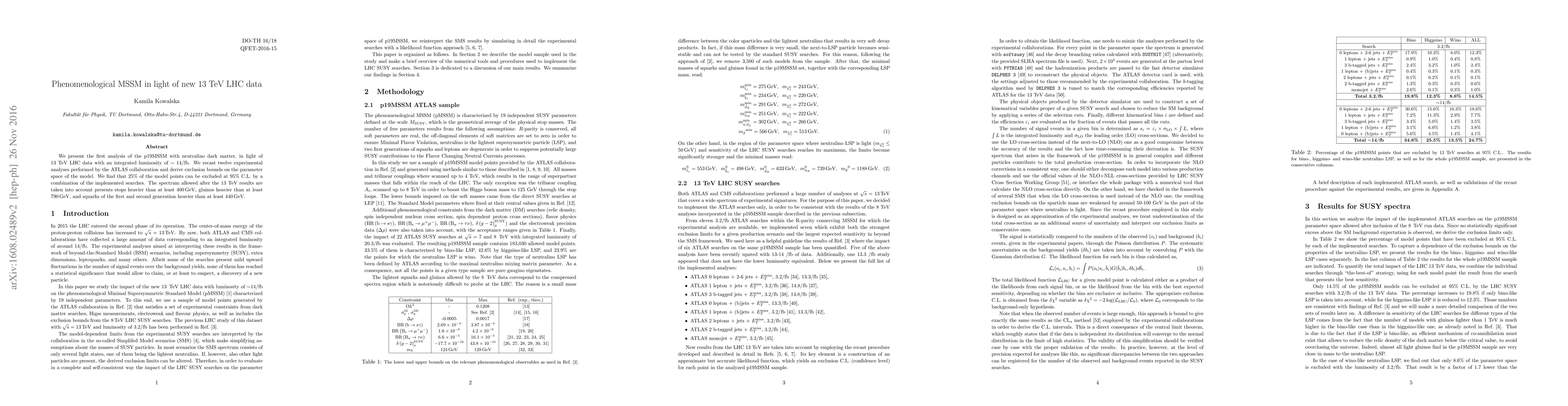 This paper analyzes the phenomenological Minimal Supersymmetric Standard Model (p19MSSM) with neutralino dark matter in light of recent 13 TeV LHC data, finding that 25% of model points are excluded at 95% confidence level. The results indicate heavier masses for stops, gluinos, and first and second-generation squarks, with lower bounds of 400 GeV, 790 GeV, and 440 GeV respectively.