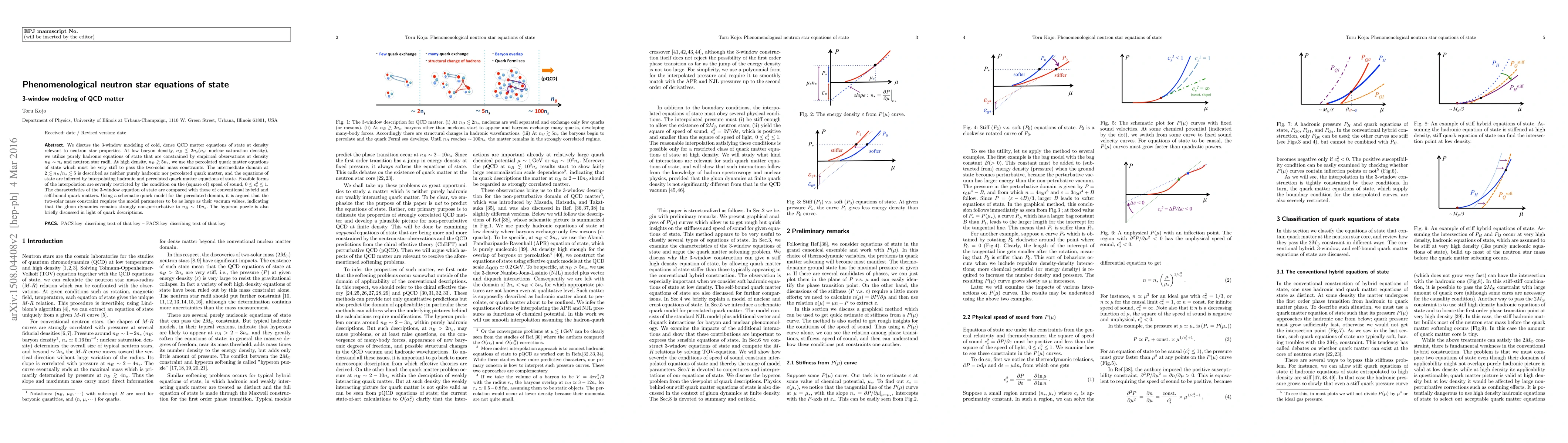 We discuss the 3-window modeling of cold, dense QCD matter equations of state at density relevant to neutron star properties. At low baryon density, n_B < ~ 2n_s (n_s: nuclear saturation density), we utilize purely hadronic equations of state that are constrained by empirical observations at density n_B ~ n_s and neutron star radii. At high density, n_B > ~ 5n_s, we use the percolated quark matter equations of state which must be very stiff to pass the two-solar mass constraints. The intermediate domain at 2 < n_B/n_s < 5 is described as neither purely hadronic nor percolated quark matter, and the equations of state are inferred by interpolating hadronic and percolated quark matter equations of state. Possible forms of the interpolation are severely restricted by the condition on the (square of) speed of sound, 0 < c_s^2 < 1. The characteristics of the 3-window equation of state are compared with those of conventional hybrid and self-bound quark matters. Using a schematic quark model for the percolated domain, it is argued that the two-solar mass constraint requires the model parameters to be as large as their vacuum values, indicating that the gluon dynamics remains strongly non-perturbative to n_B ~ 10n_s. The hyperon puzzle is also briefly discussed in light of quark descriptions.