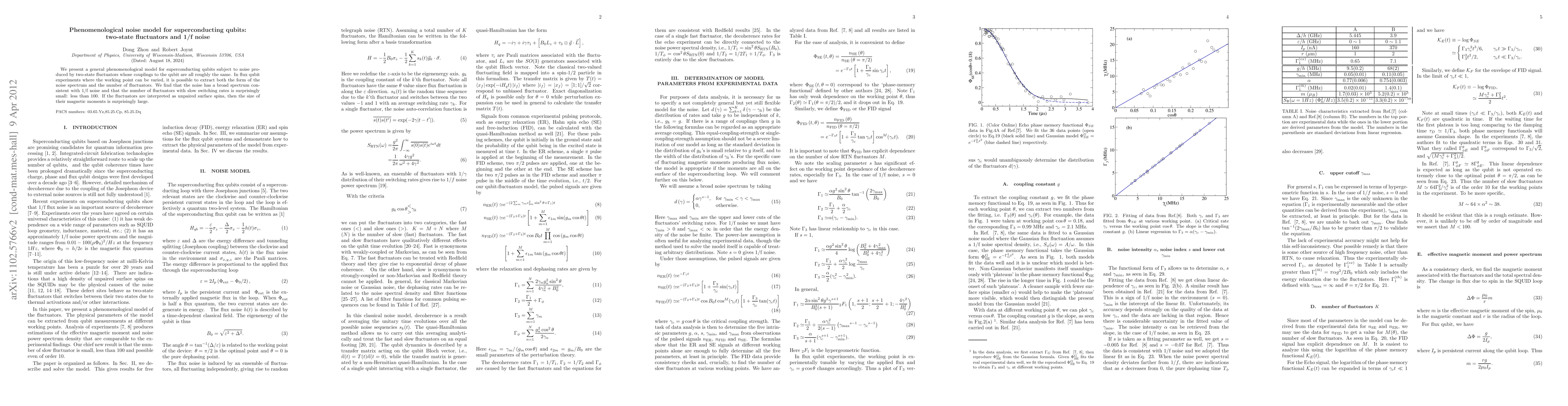 This paper introduces a phenomenological model for noise in superconducting qubits due to two-state fluctuators, revealing a broad noise spectrum consistent with 1/f noise. Experiments show the number of slow-switching fluctuators is fewer than 100, suggesting large magnetic moments if they are unpaired surface spins.