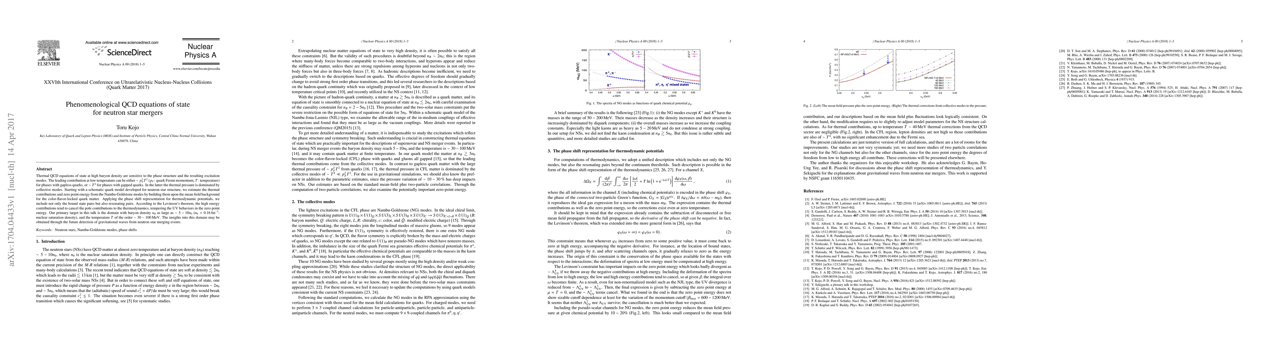 This paper develops phenomenological QCD equations of state for high baryon density conditions, focusing on neutron star mergers. It estimates thermal contributions and zero-point energy from Nambu-Goldstone modes in color-flavor-locked quark matter, aiming to understand the phase structure and thermal pressure at densities up to 5-10 times nuclear saturation density and temperatures around 30-100 MeV.
