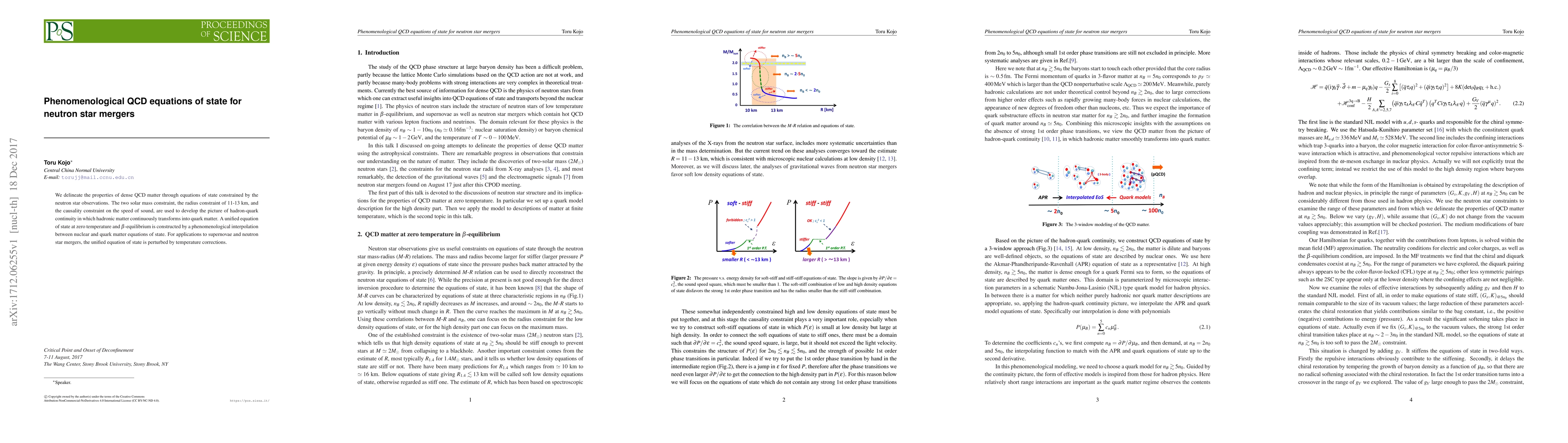 We delineate the properties of dense QCD matter through equations of state constrained by the neutron star observations. The two solar mass constraint, the radius constraint of 11-13 km, and the causality constraint on the speed of sound, are used to develop the picture of hadron-quark continuity in which hadronic matter continuously transforms into quark matter. A unified equation of state at zero temperature and beta-equilibrium is constructed by a phenomenological interpolation between nuclear and quark matter equations of state. For applications to supernovae and neutron star mergers, the unified equation of state is perturbed by temperature corrections.
