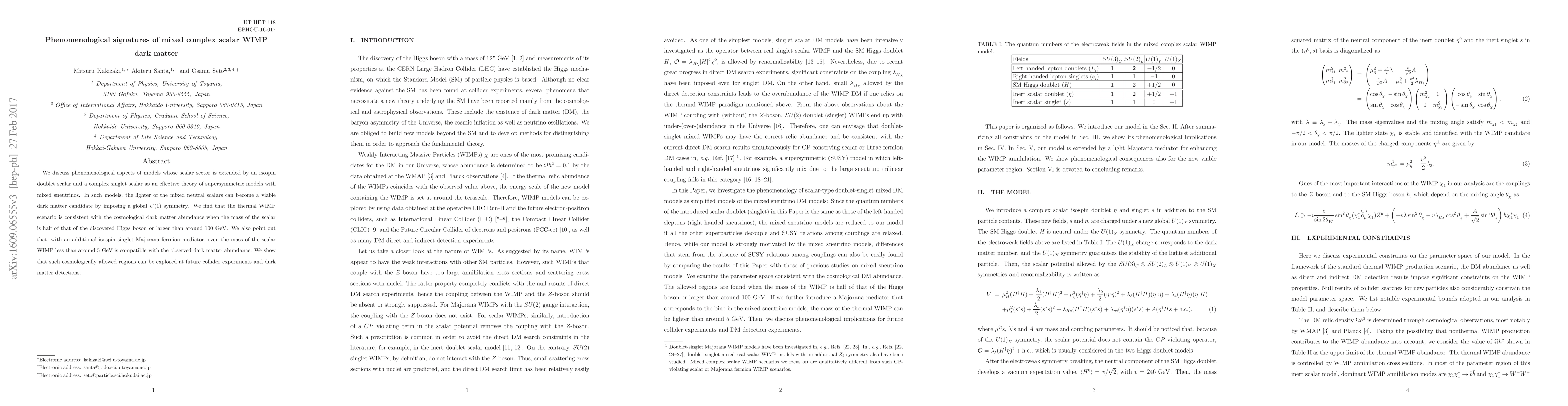 We discuss phenomenological aspects of models whose scalar sector is extended by an isospin doublet scalar and a complex singlet scalar as an effective theory of supersymmetric models with mixed sneutrinos. In such models, the lighter of the mixed neutral scalars can become a viable dark matter candidate by imposing a U(1) symmetry. We find that the thermal WIMP scenario is consistent with the cosmological dark matter abundance when the mass of the scalar is half of that of the discovered Higgs boson or larger than around 100 GeV. We also point out that, with an additional isospin singlet Majorana fermion mediator, even the mass of the scalar WIMP less than around 5 GeV is compatible with the observed dark matter abundance. We show that such cosmologically allowed regions can be explored at future collider experiments and dark matter detections.
