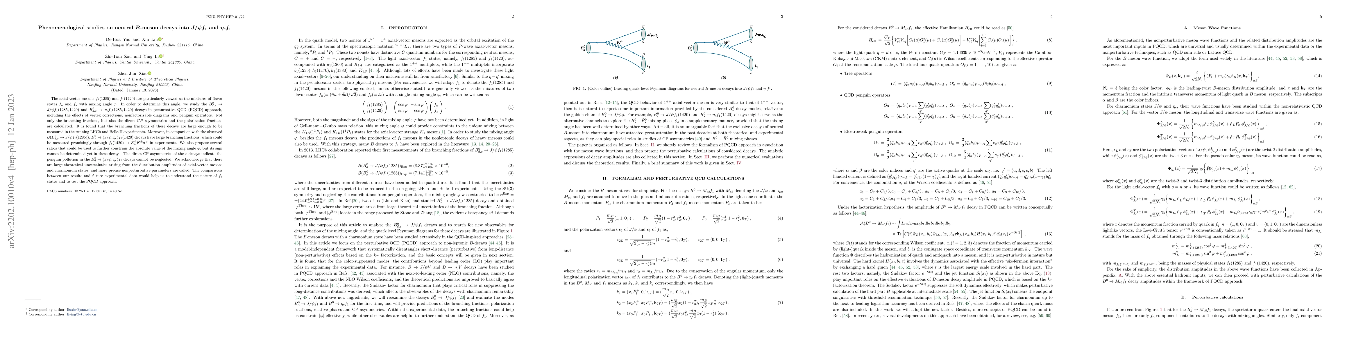 The axial-vector mesons $f_1(1285)$ and $f_1(1420)$ are particularly viewed as the mixtures of flavor states $f_n$ and $f_s$ with mixing angle $\varphi$. In order to determine this angle, we study the $B_{d,s}^0\to J/\psi f_1(1285,1420)$ and $B_{d,s}^0\to \eta_c f_1(1285,1420)$ decays in perturbative QCD (PQCD) approach, including the effects of vertex corrections, nonfactorizable diagrams and penguin operators. Not only the branching fractions, but also the direct $CP$ asymmetries and the polarization fractions are calculated. It is found that the branching fractions of these decays are large enough to be measured in the running LHCb and Belle-II experiments. Moreover, in comparison with the observed ${\cal B}(B_{d,s}^0 \to J/\psi f_1(1285))$, $B_s^0 \to (J/\psi, \eta_c) f_1(1420)$ decays have large branching fractions, which could be measured promisingly through $f_1(1420) \to K_S^0 K^\pm \pi^\mp$ in experiments. We also propose several ratios that could be used to further constrain the absolute value of the mixing angle $\varphi$, but its sign cannot be determined yet in these decays. The direct CP asymmetries of these decays indicate the penguin pollution in the $B_d^0 \to (J/\psi, \eta_c) f_1$ decays cannot be neglected. We acknowledge that there are large theoretical uncertainties arising from the distribution amplitudes of axial-vector mesons and charmonium states, and more precise nonperturbative parameters are called. The comparisons between our results and future experimental data would help us to understand the nature of $f_1$ states and to test the PQCD approach.