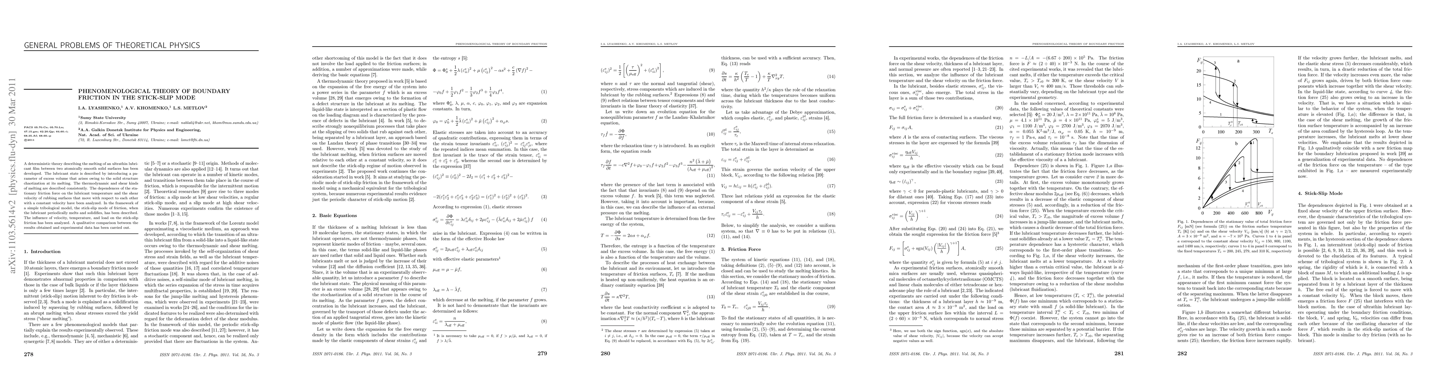 This paper develops a deterministic theory for boundary friction in stick-slip mode, focusing on the melting of an ultrathin lubricant film between smooth solid surfaces. It analyzes the friction force's dependence on temperature and shear velocity, and compares theoretical results with experimental data.