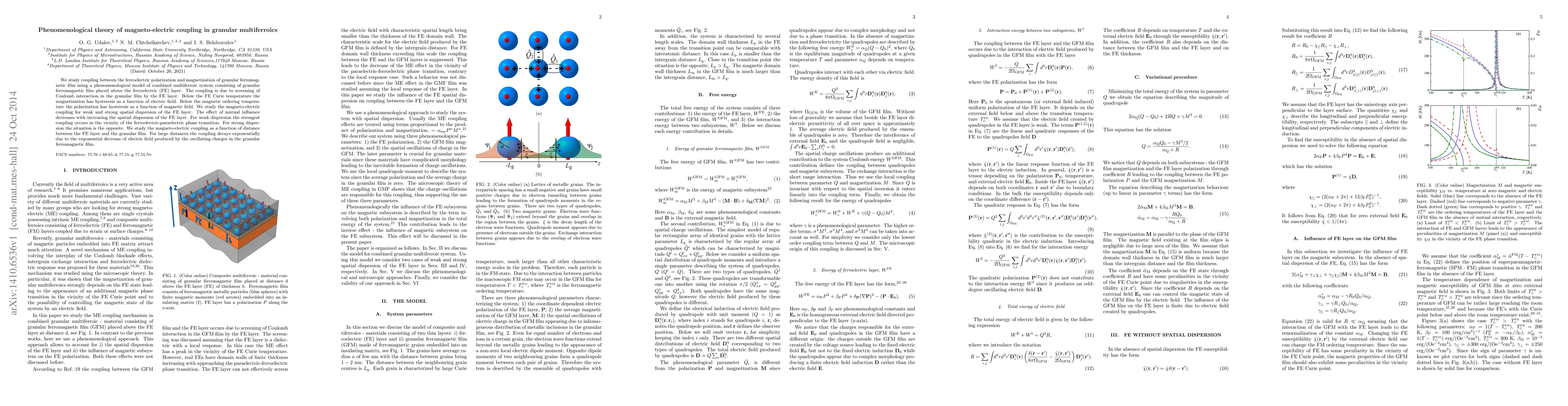This paper develops a phenomenological model to study magneto-electric coupling in granular multiferroics, where ferroelectric polarization and magnetization interact via Coulomb interaction screening. The model reveals hysteresis effects in both polarization and magnetization under external fields, with coupling strength varying with spatial dispersion and distance between layers.