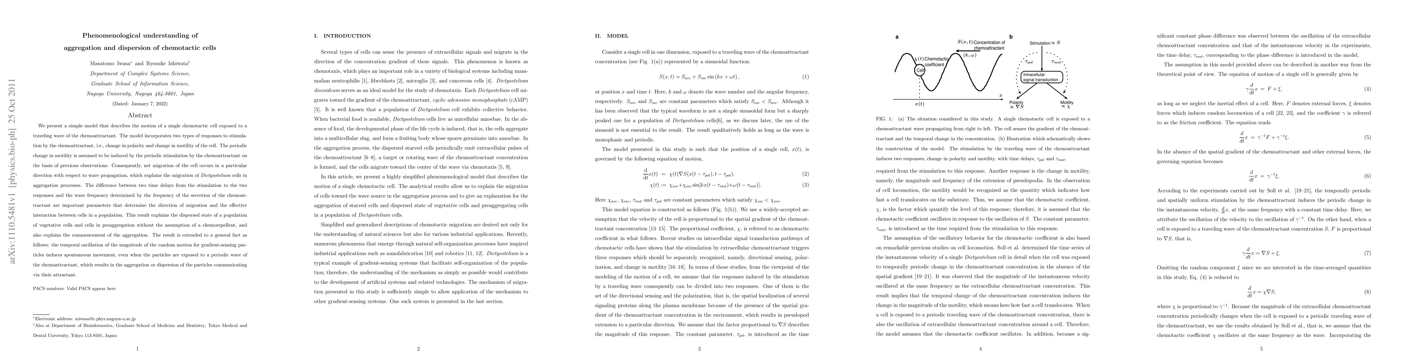 We present a simple model that describes the motion of a single chemotactic cell exposed to a traveling wave of the chemoattractant. The model incorporates two types of responses to stimulation by the chemoattractant, i.e., change in polarity and change in motility of the cell. The periodic change in motility is assumed to be induced by the periodic stimulation by the chemoattractant on the basis of previous observations. Consequently, net migration of the cell occurs in a particular direction with respect to wave propagation, which explains the migration of Dictyostelium cells in aggregation processes. The difference between two time delays from the stimulation to the two responses and the wave frequency determined by the frequency of the secretion of the chemoattractant are important parameters that determine the direction of migration and the effective interaction between cells in a population. This result explains the dispersed state of a population of vegetative cells and cells in preaggregation without the assumption of a chemorepellent, and also explains the commencement of the aggregation. The result is extended to a general fact as follows: the temporal oscillation of the magnitude of the random motion for gradient-sensing particles induces spontaneous movement, even when the particles are exposed to a periodic wave of the chemoattractant, which results in the aggregation or dispersion of the particles communicating via their attractant.