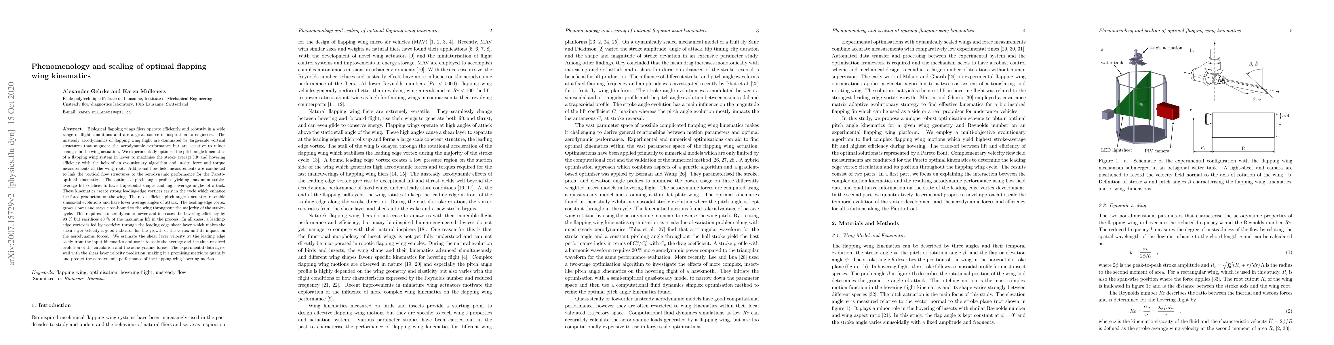This research optimizes flapping wing kinematics for maximum lift and hovering efficiency using evolutionary algorithms and flow field measurements. The study finds that trapezoidal pitch angle profiles with high average angles of attack generate strong leading-edge vortices, enhancing lift but requiring more power, while sinusoidal profiles improve efficiency but reduce lift.