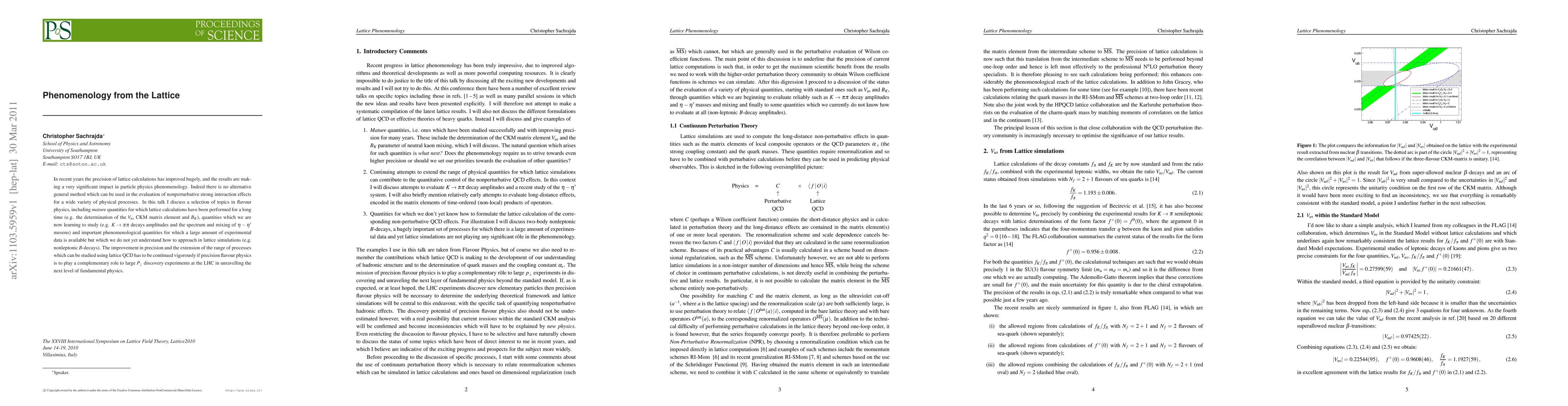 In recent years the precision of lattice calculations has improved hugely, and the results are making a very significant impact in particle physics phenomenology. Indeed there is no alternative general method which can be used in the evaluation of nonperturbative strong interaction effects for a wide variety of physical processes. In this talk I discuss a selection of topics in flavour physics, including \textit{mature} quantities for which lattice calculations have been performed for a long time (e.g. the determination of the $V_{us}$ CKM matrix element and $B_K$), quantities which we are now learning to study (e.g. $K\to\pi\pi$ decays amplitudes and the spectrum and mixing of $\eta-\eta^\prime$ mesons) and important phenomenological quantities for which a large amount of experimental data is available but which we do not yet understand how to approach in lattice simulations (e.g. nonleptonic B-decays). The improvement in precision and the extension of the range of processes which can be studied using lattice QCD has to be continued vigorously if precision flavour physics is to play a complementary role to large $p_\perp$ discovery experiments at the LHC in unravelling the next level of fundamental physics.